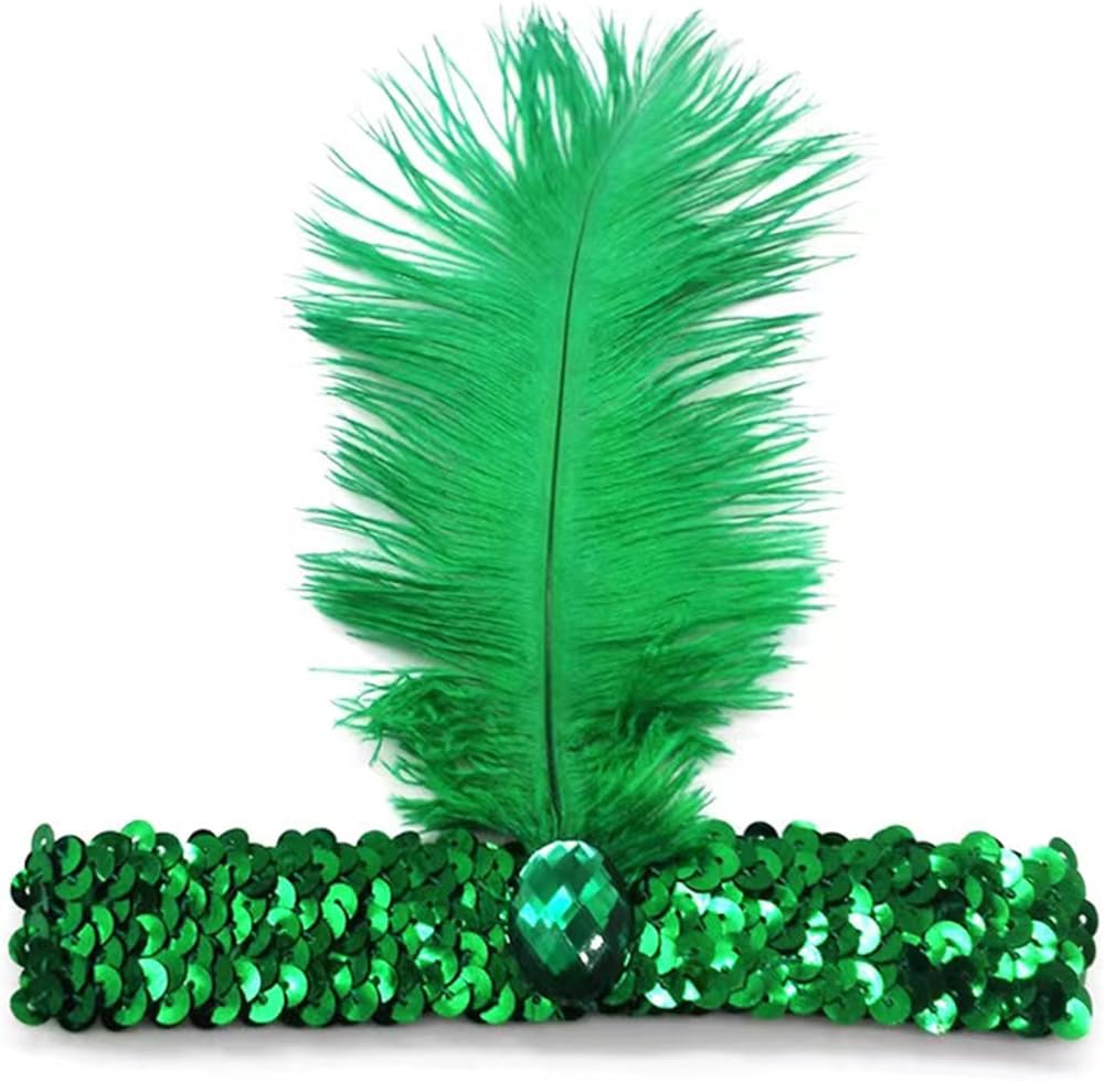 Green Glitter Feather Style - Ostrich hair sequin with diamond feather headband. These headbands are designed with velvet textured back for secure wear and comfortable fit without slipping off or riding up, well conform to the shape of your head.