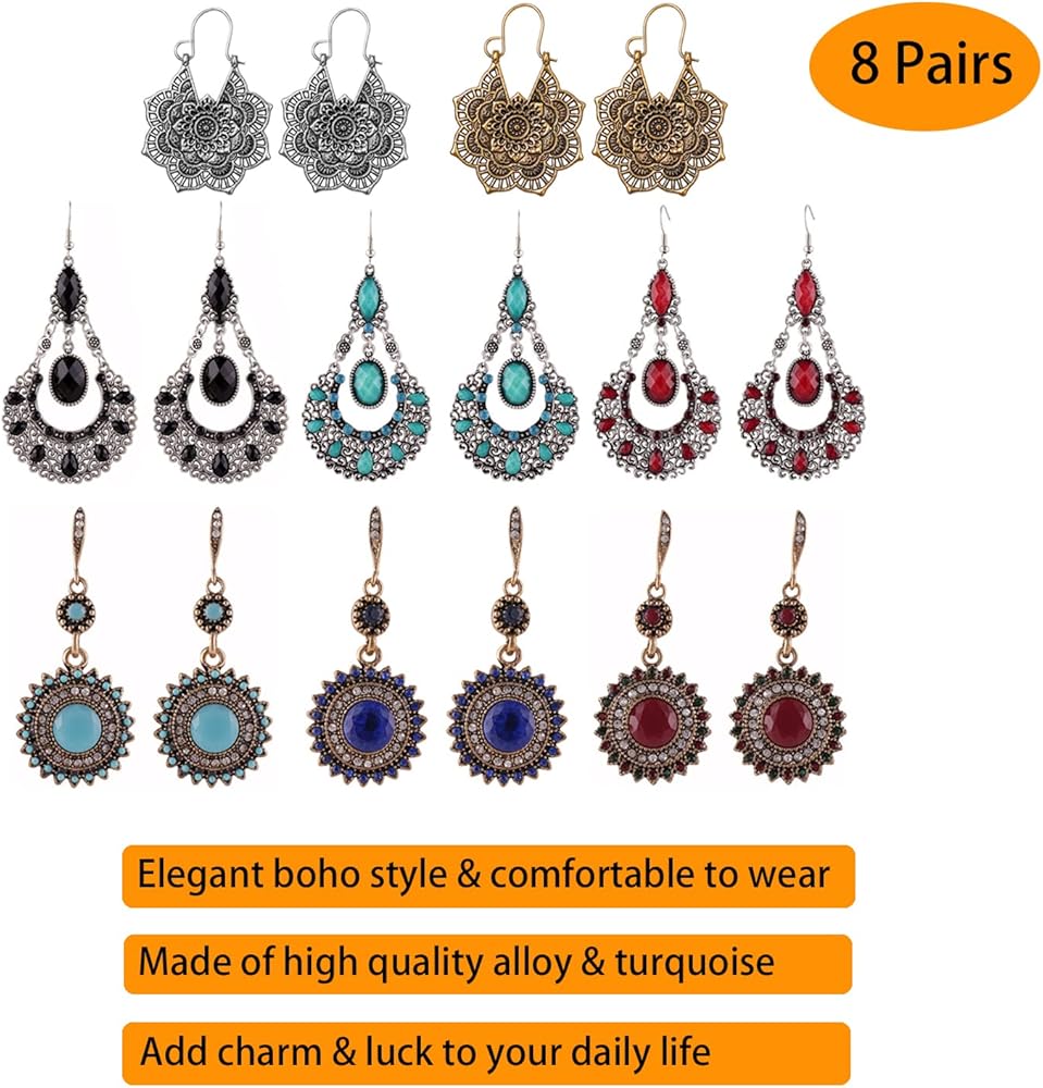 Package includes: 8 pairs * boho vintage earrings. These boho style earrings are great costume accessories to your daily life, provide a variety of different collocation, suitable for different occasions, and make you charming and attractive.