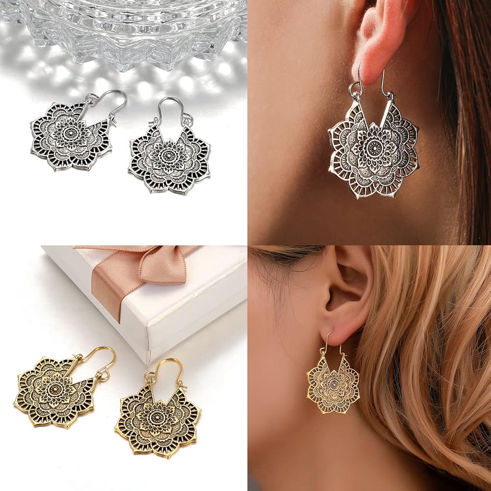 8 Pairs Boho Lotus Dangle Earrings for Women - Vintage Turquoise Western Jewelry Eardrop - Bohemian Dangling Ear Rings Native American Womens Jewelry - Valentines Mother's Day Gifts, 8 pairs, Zinc,