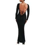 الميزات: فستان ضيوف حفل زفاف خريف 2023، فستان طويل الأكمام، رقبة على شكل قارب، فستان طويل مثير، ظهر مفتوح، لون خالص، مقاس نحيف، خصر مربوط، فستان طويل برباط خلفي، فستان ضيق كاجوال. فستان أسود