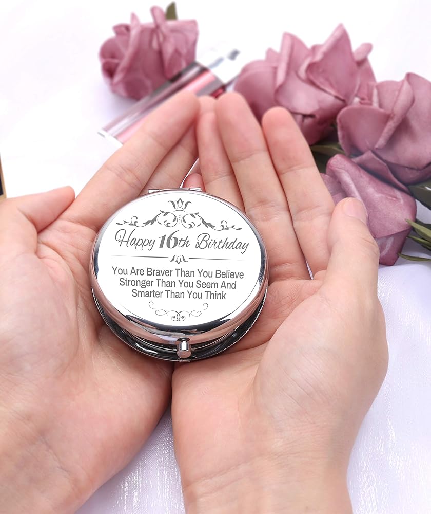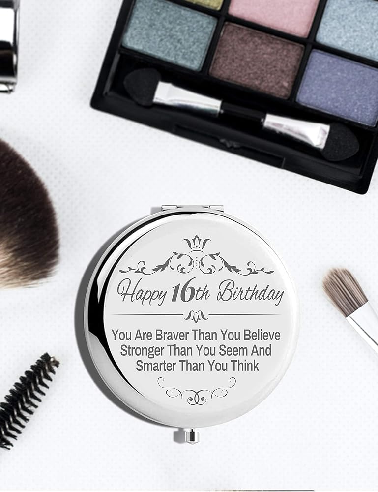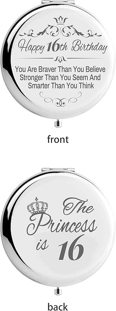 • الفتيات بعمر 16 عامًا: واجهة مرآة المكياج Sweet 16 مكتوب عليها "عيد ميلاد سعيد السادس عشر، أنت أكثر شجاعة مما تعتقد. أقوى مما تبدو وأذكى مما تعتقد”. نعود بقول "الأميرة تبلغ من العمر 16 عامًا". ستعيد ذكريات مذهلة عندما تستخدمها فتاة عيد الميلاد البالغة من العمر 16 عامًا في كل مرة.
