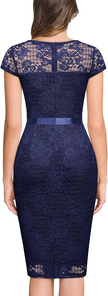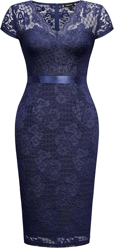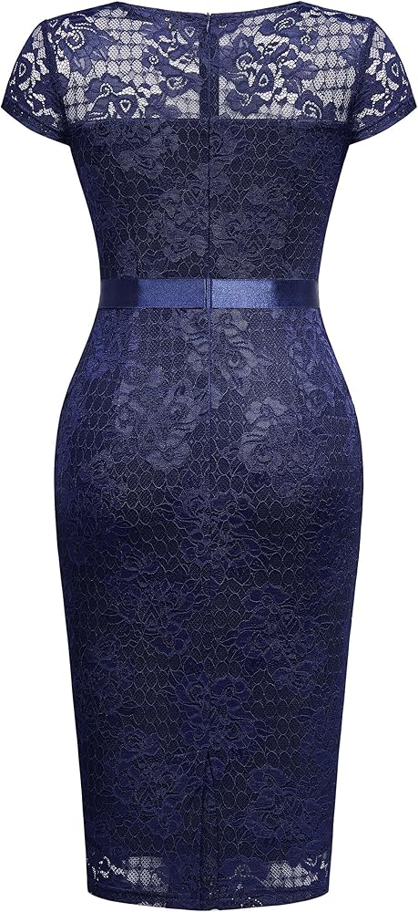 رقبة على شكل حرف V أنيقة، نمط دانتيل زهور كلاسيكي، أكمام قصيرة، طول الركبة، سحاب مخفي في الخلف.
