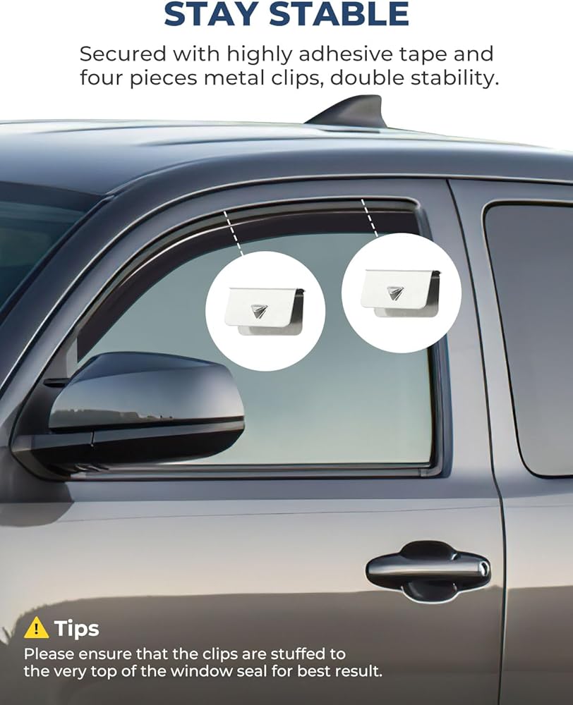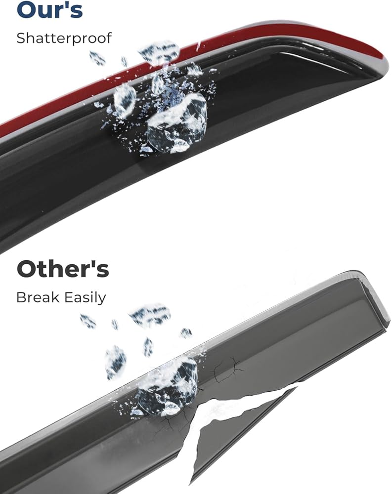 مقاوم للكسر ومتانة ممتازة - واقي نافذة التهوية مصنوع من الأكريليك عالي الجودة القوي والمقاوم للكسر، لن ينحني أو ينكسر أو يتشقق. تتميز واقيات المطر لدينا بتصميم مرن ومبسط، وتستخدم شريطًا لاصقًا أصليًا معتمدًا، للتأكد من عدم سقوطها على الطريق السريع.