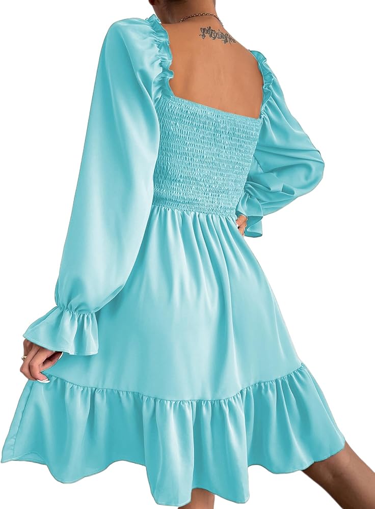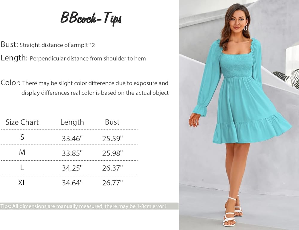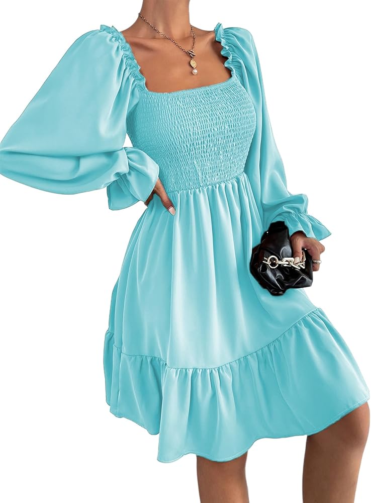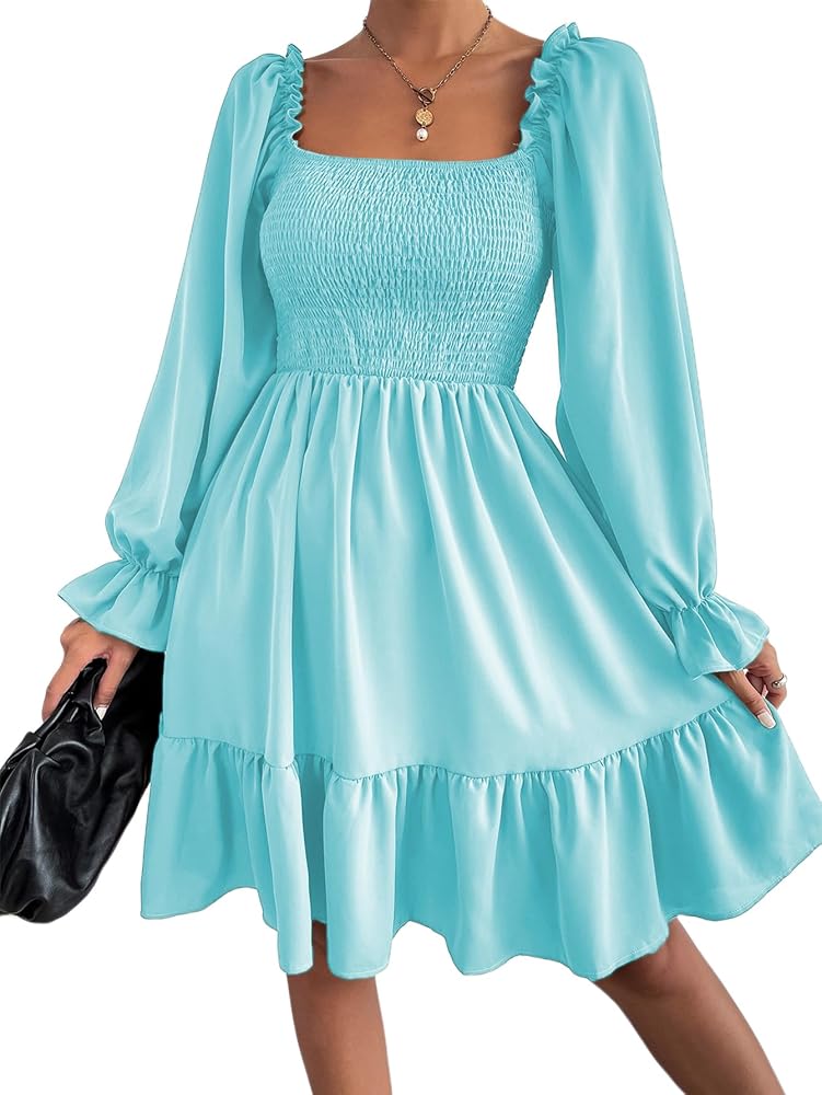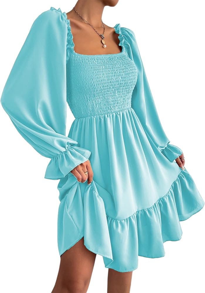 المزايا: رقبة مربعة، أكمام طويلة منتفخة، صدرية مكشكشة، أرجوحة مكشكشة، تصميم أنيق، فستان قصير فضفاض.