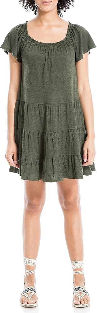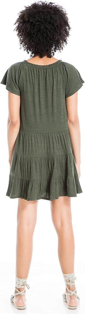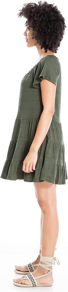 This short dress features feminine short sleeves, tiered construction, and a crew neckline.