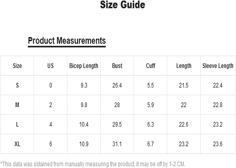 Large: Bicep Length: 10.4", Bust: 29.5", Cuff: 6.3", Length: 22.6", Sleeve Length: 23.2"