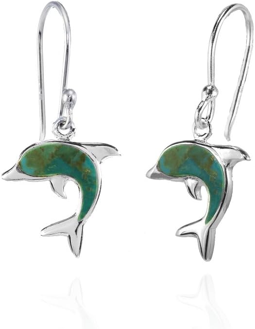 These gorgeous earrings feature an Abalone or Simulated Turquoise dolphin in a polished setting for a unique look. The earrings are crafted of fine sterling silver and secure with fishhooks. These earrings can be purchased as earrings for women, earrings for teen girls, and earrings for children.