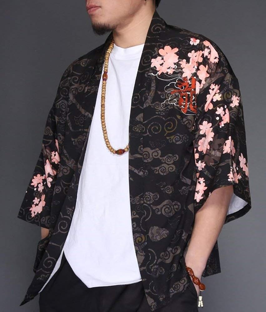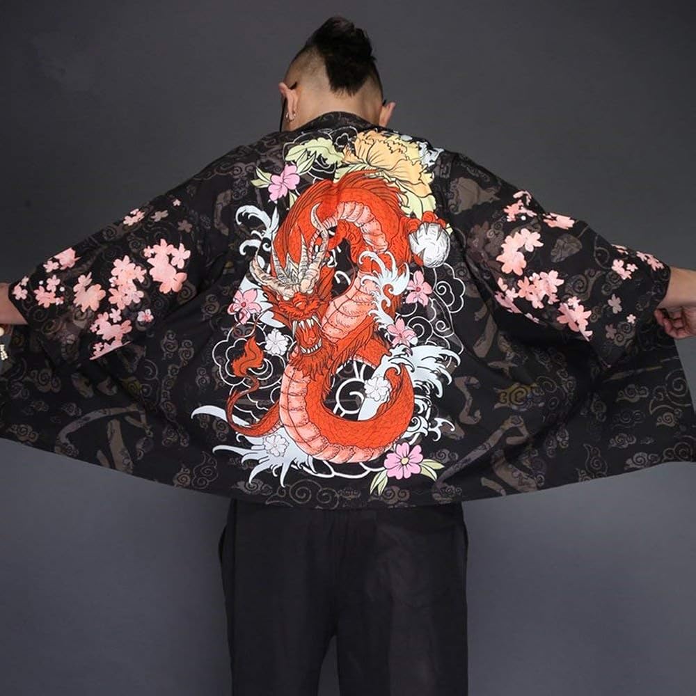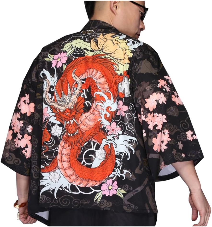 - قميص كيمونو قصير مطبوع عليه زهور تنين صيفي كاجوال.