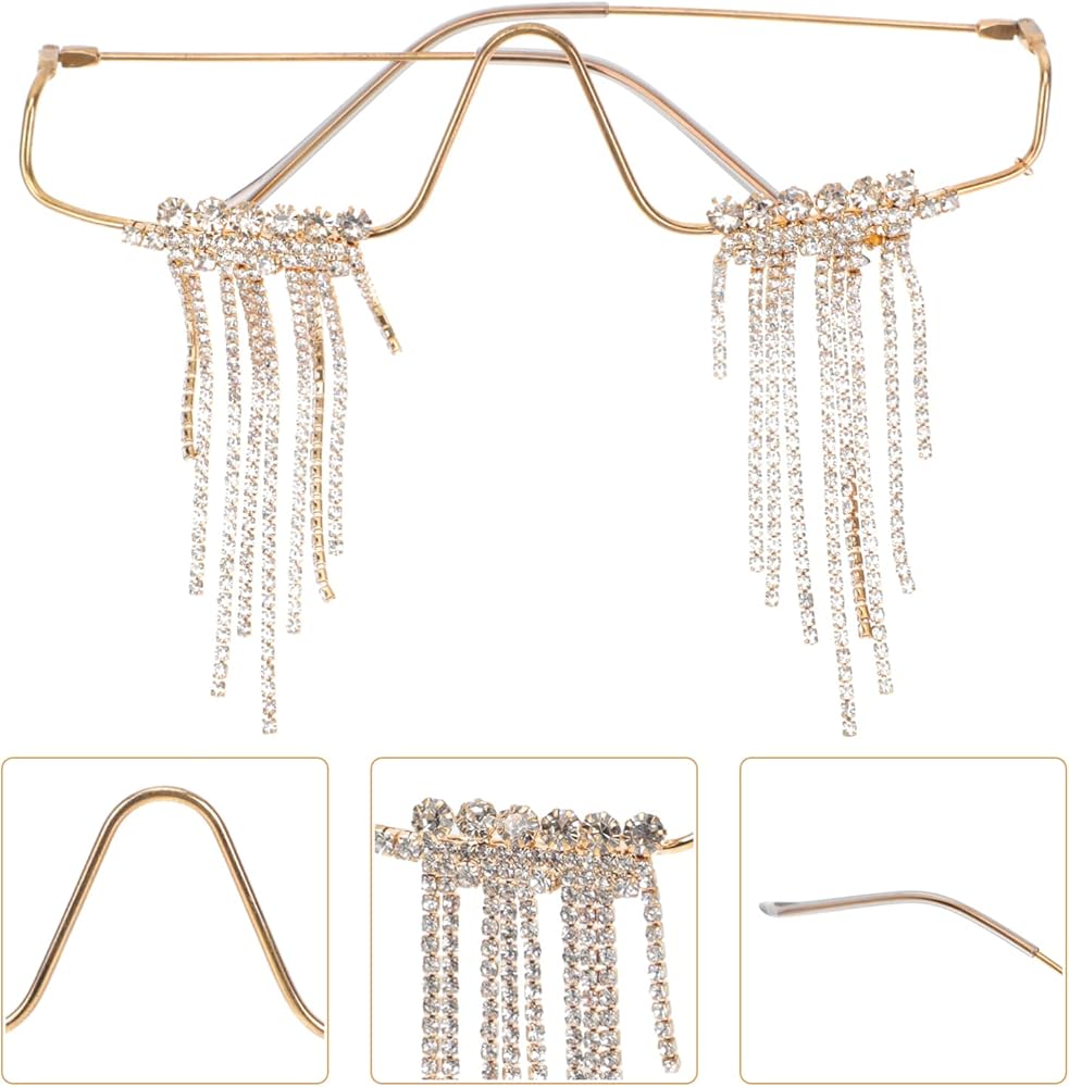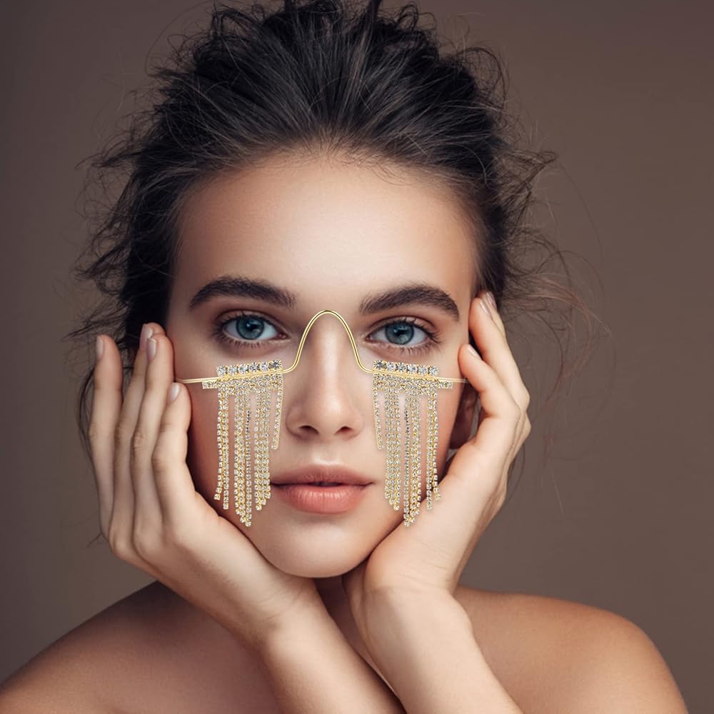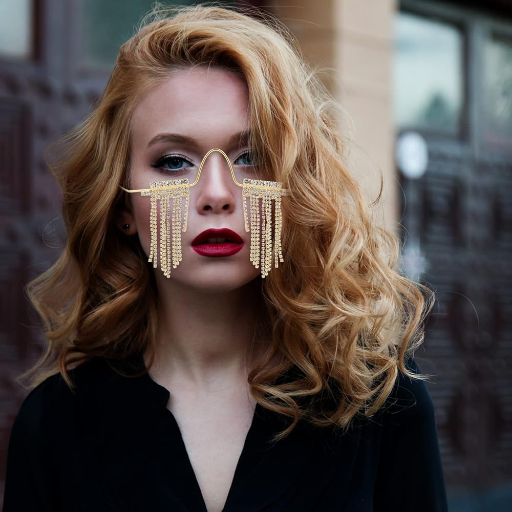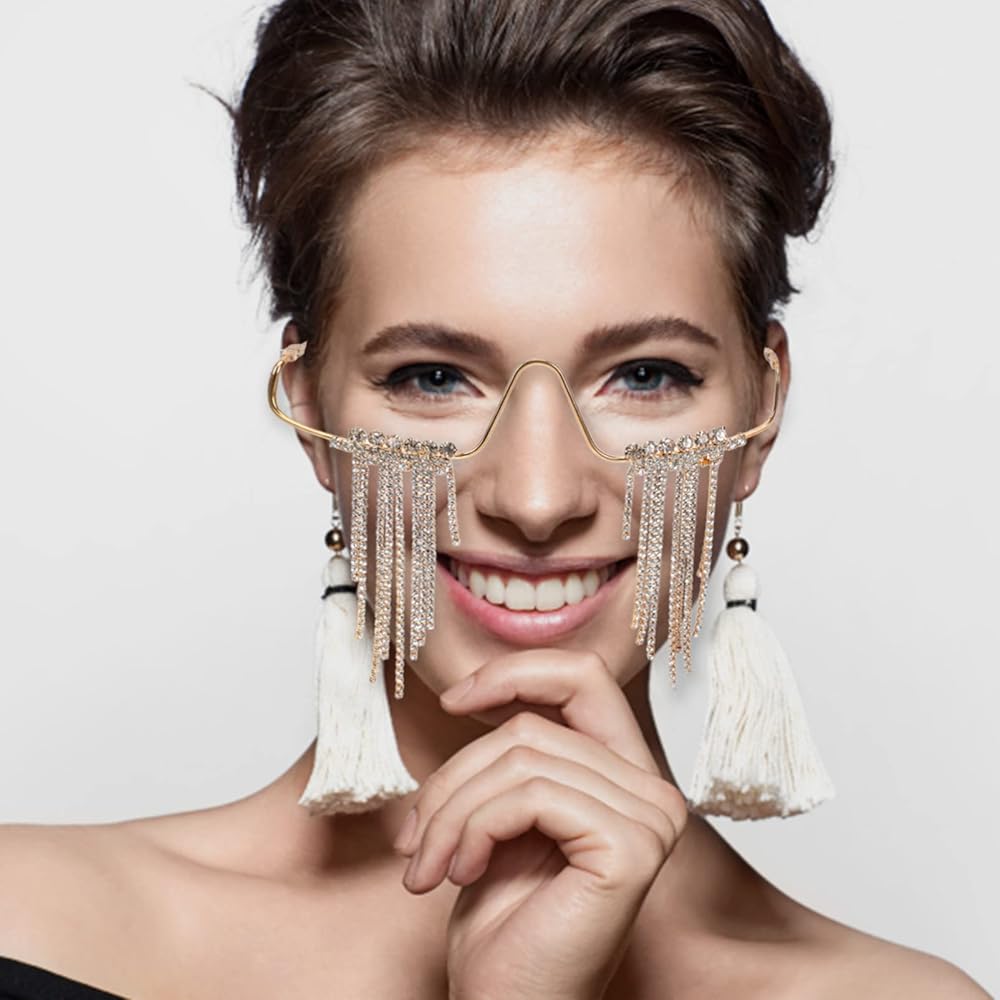 نظارات شمسية بشرابة: مع إحساس بالتصميم، فإن تصميم الشرابة المميز يجعلها دعامة أزياء للحفلات. يمكن أن تكون الكريستالات الماسية اللامعة بدون عدسة هي الزخارف الأكثر شعبية