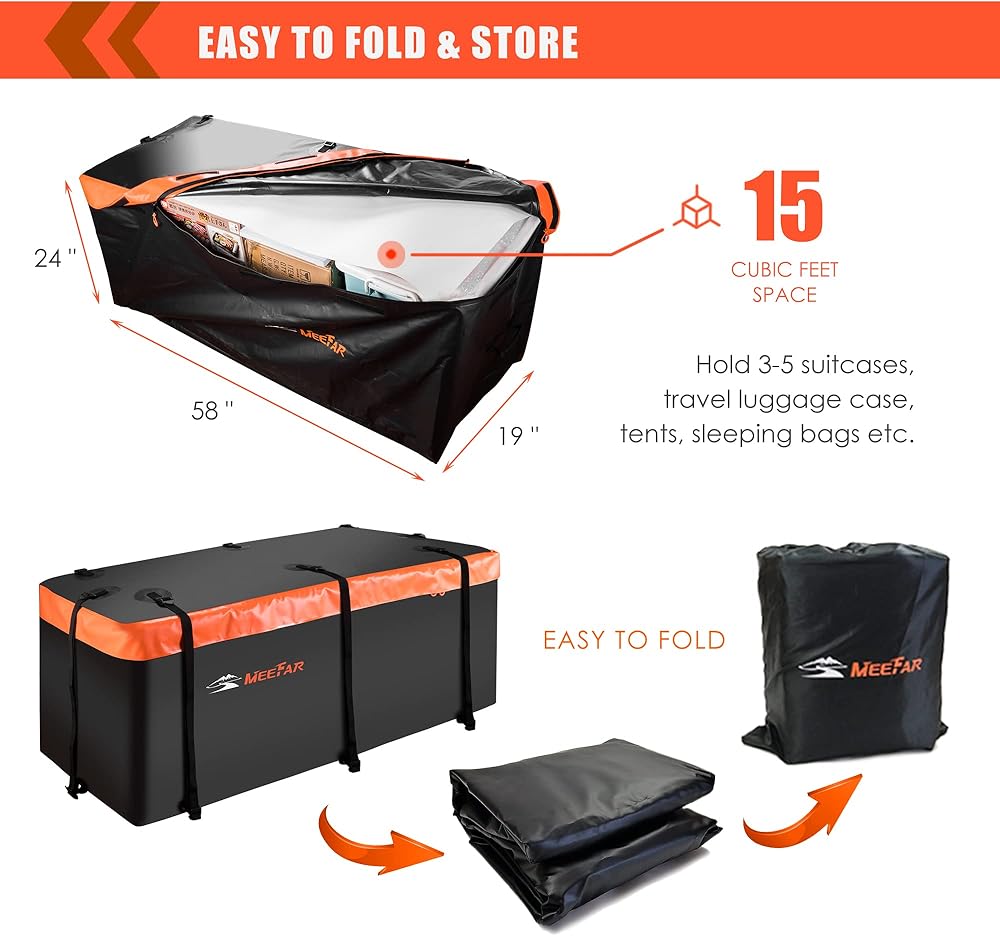 MeeFar Hitch Mount Cargo Carrier Bag غطاء ناعم مقاوم للماء بنسبة 100%، 15 قدمًا مكعبًا (58 بوصة 19 بوصة 24 بوصة) تتضمن 8 أشرطة معززة لالتقاط الشاحنات وجميع المركبات مع سلة شحن فولاذية