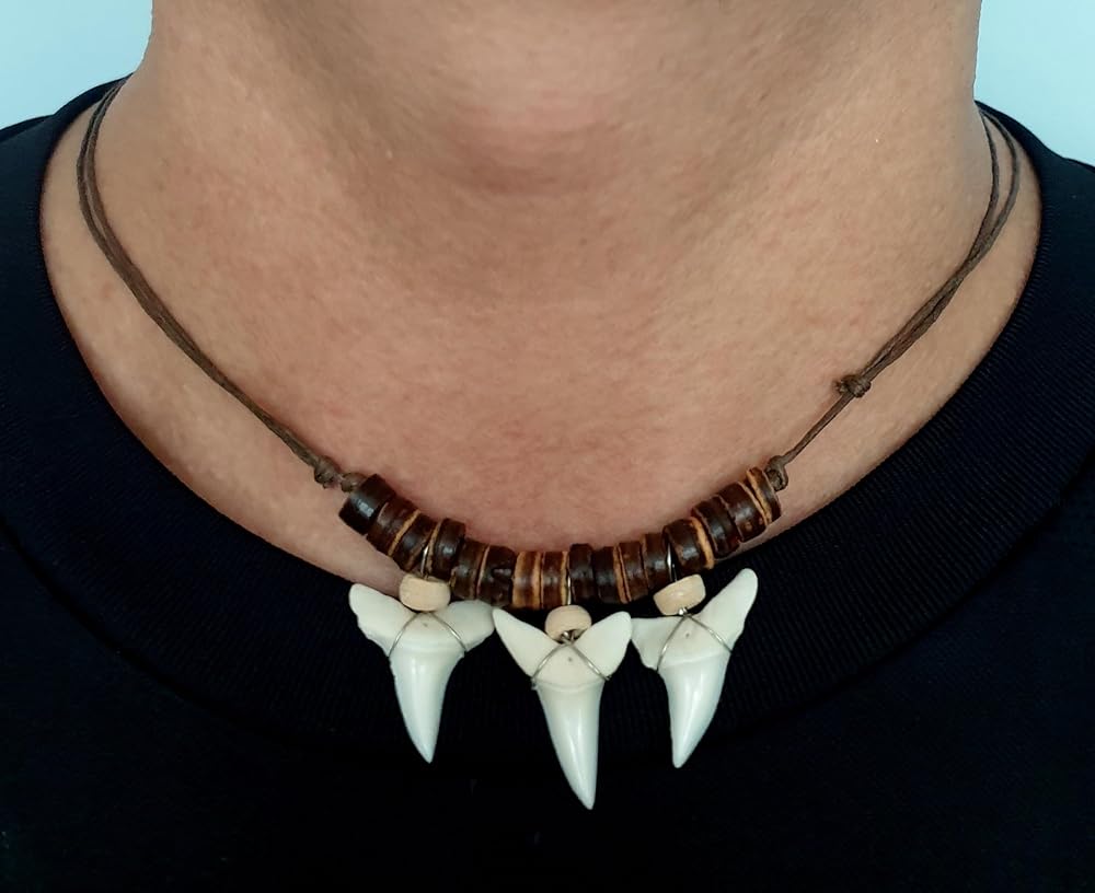 3 قلادة ماكو أصلية على شكل أسنان القرش للرجال والنساء والأولاد والبنات مع خرز خشبي وسلك مشمع قابل للتعديل مجوهرات مصنوعة يدويًا EA050