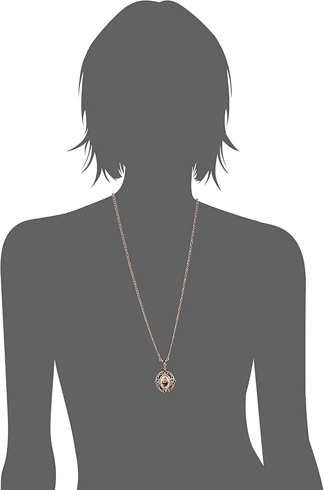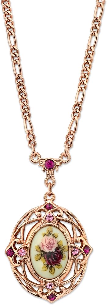 Long links lead to a bail containing an amethyst color crystal. The pendant is a floral motif applied in a style that resembles decoupage. The filigree frame is set with both light and traditional amethyst color crystals. Measurements:Â 28" L x 2" H x 1.25" W Made In USA MANOR HOUSE COLLECTION Presenting a 1928 Jewelry Classic. The Manor House Collection features our timeless vintage floral motif, which has become a beloved, signature design element for more than a few decades. Feminine floral accents against a backdrop of rose gold-tone metals lend itself as a perfect accent piece when you're looking for some true vintage inspiration.
