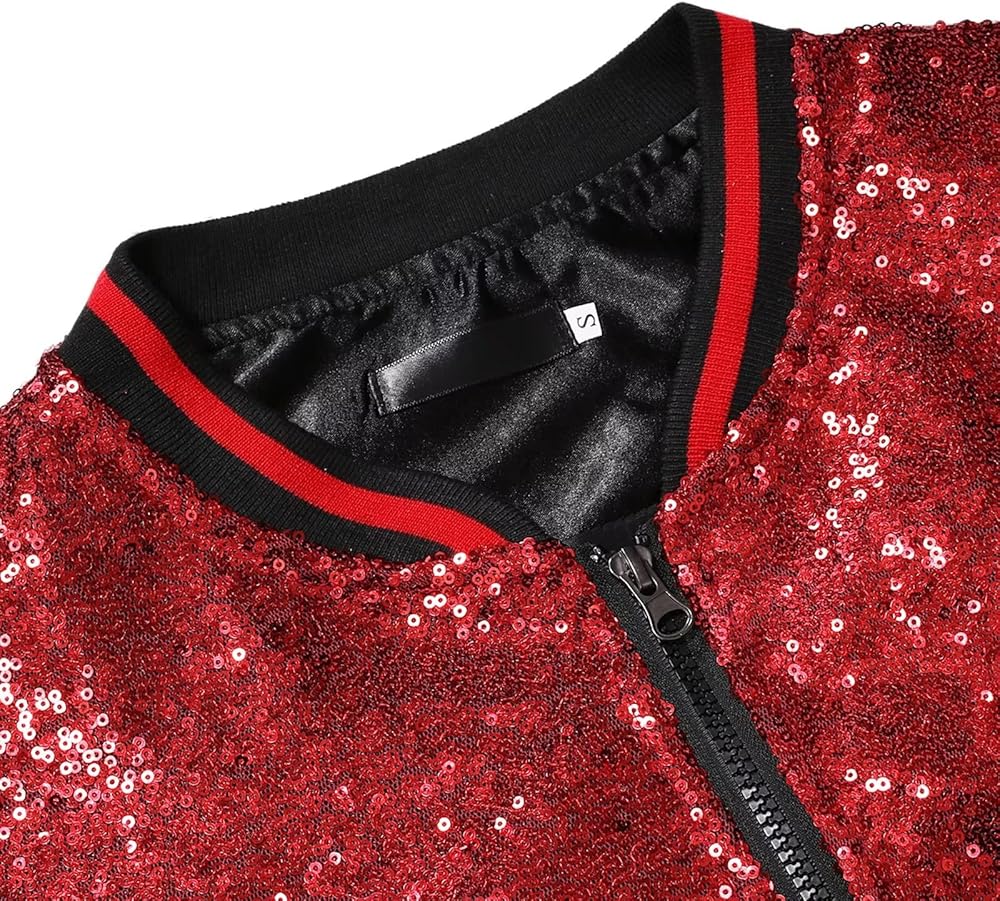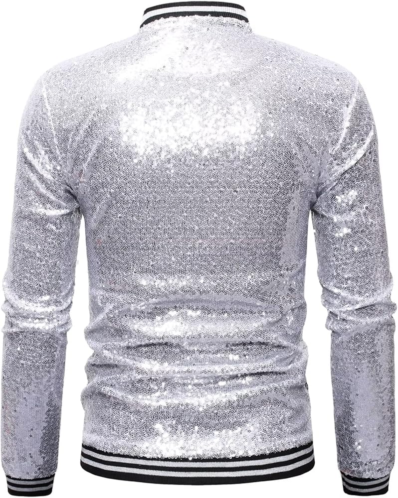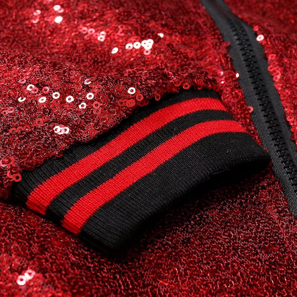 • 【Feature】Baseball jacket neck, Dazzling sequin design, Long sleeve, Ribbed collar, cuffs, hem, Fit, Designed with full front zip closure & roomy fit. These unique designs add charm to this metallic jacket.