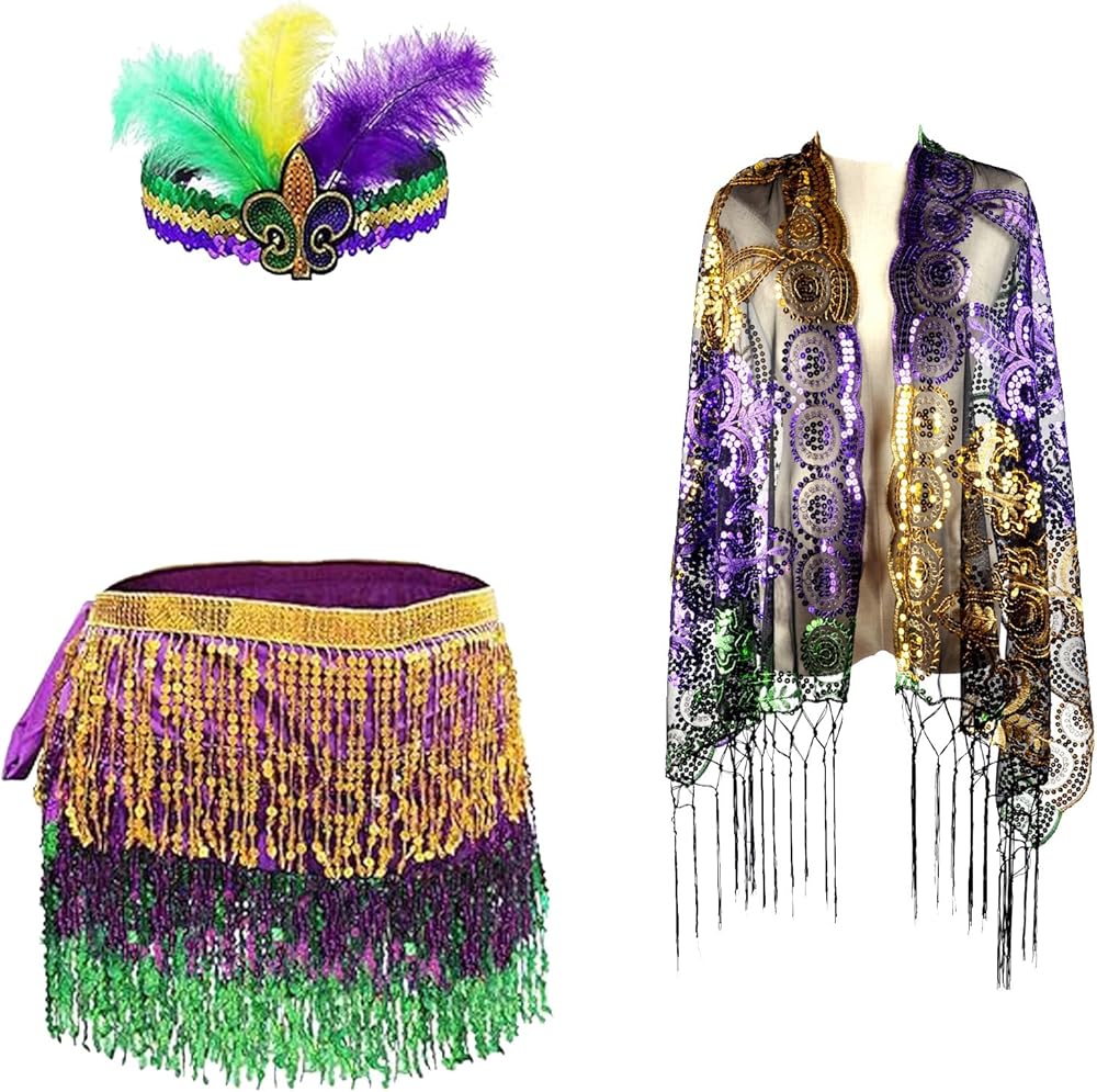 Mardi Gras Sequins Wrap Skirt,Mardi Gras shawl scarfa and Feather Sequin Headband for Women party costume accessories