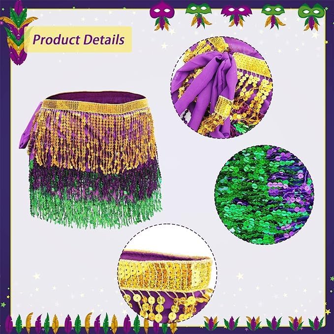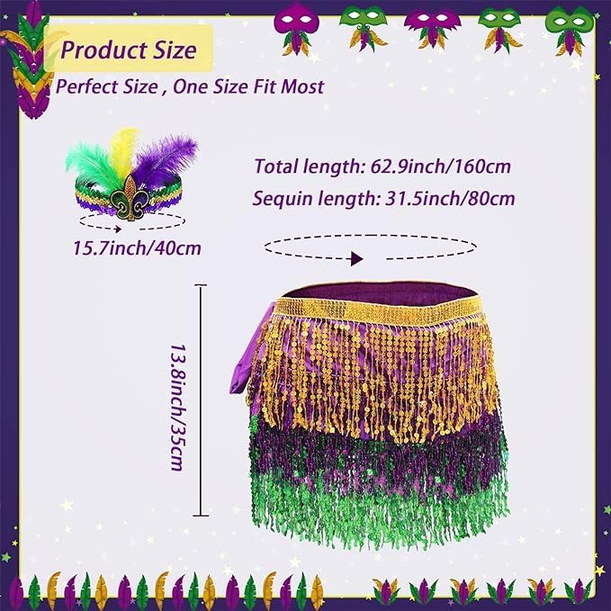 • Perfect Mardi Gras Outfits: You will get 1 Pcs mardi gras sequins wrap skirt,1 Pcs Mardi Gras shawl scarfa and one feather headband, a unique outfit that will shine at your party, they are the perfect costume accessories for mardi gras!