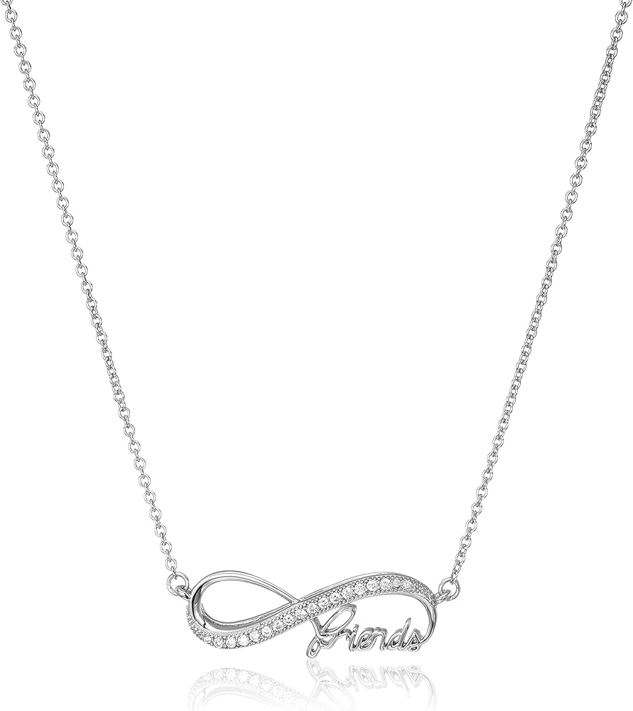 الطراز: قلادة إنفينيتي فريندز من الفضة الإسترلينية مع الزركونيا المكعبة بطول 18 بوصة (45.7 سم)؛ تتميز برمز لا نهاية له مع كلمة "أصدقاء" ومزينة بأحجار الزركونيا المكعبة لمزيد من التألق.