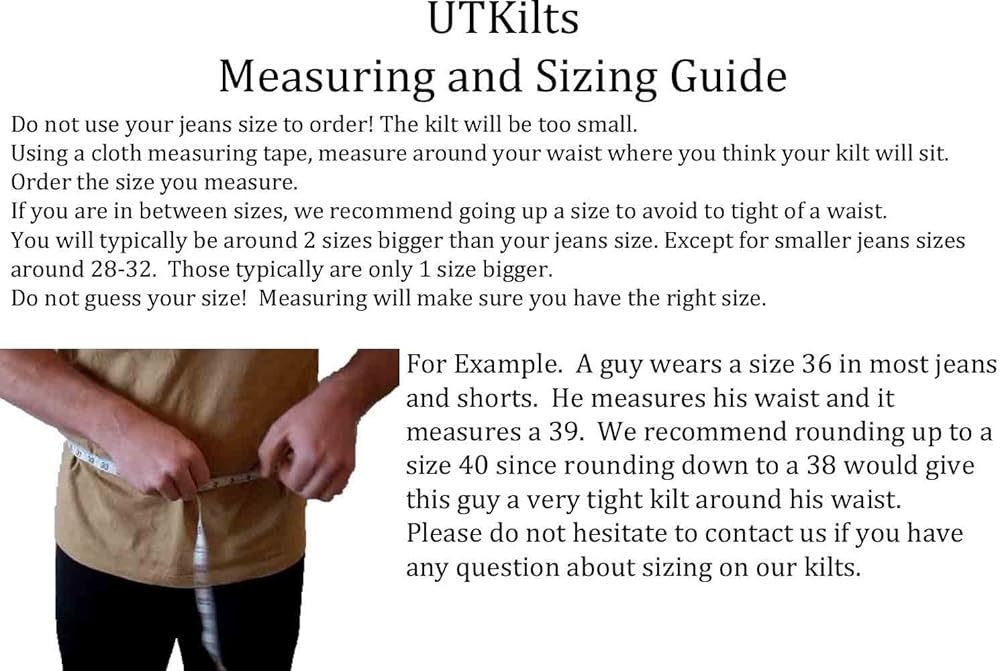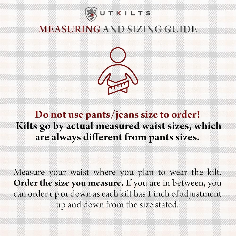 Do you want a kilt as a way to celebrate your Scottish ancestry? Or maybe you're simply interested in expanding your wardrobe. Either way, this tartan utility kilt will not disappoint. It's designed to be easy for kilt beginners but will work great on anyone regardless of their Scottish clothing experience. All our kilts are heavy-duty and will look great for any occasion. Whether you wear this kilt casually or pair it with a sporran and belt, you're sure to stand out. Here at UT Kilts, we want you to choose the best-fitting kilt possible. Do NOT guess your size or order your jean size. Using a cloth measuring tape, measure around your waist where you think your kilt will sit. Order the size you measure. If you are in between sizes, we recommend going up a