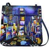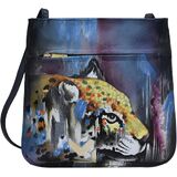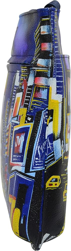 Hand painted original artwork. Genuine leather exterior and trim. Top zip closure. Inside zippered wall pocket. Cell phone pocket. Key holder. Front zip pocket and rear slip pocket. Removable fabric optical case. Sling crossbody strap with drop of 23".