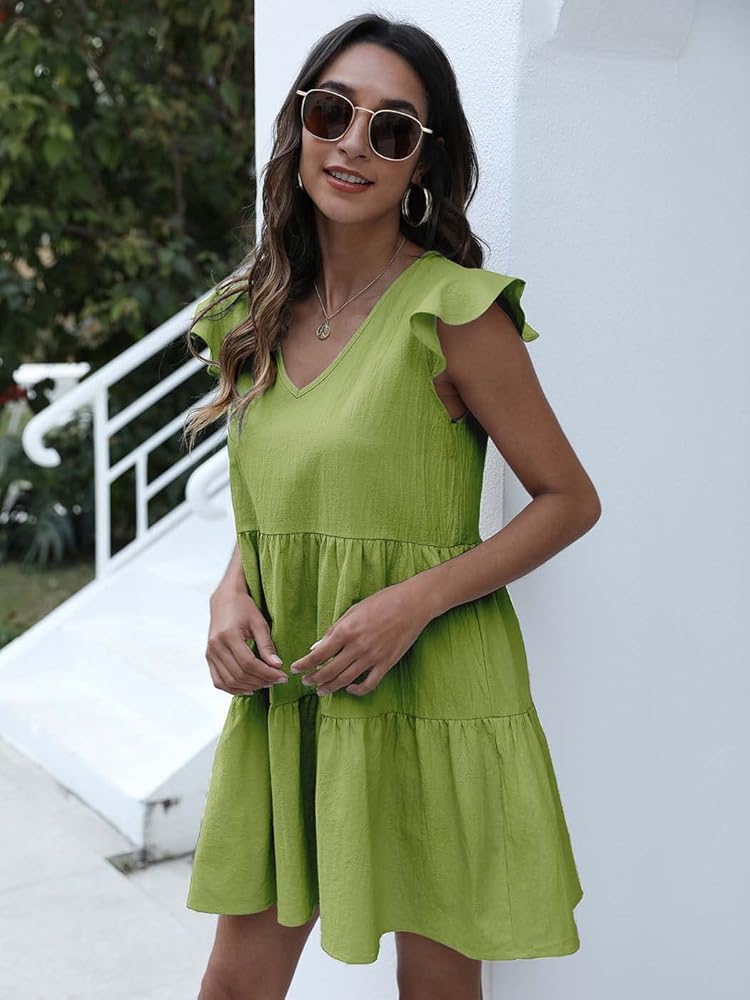 فستان فوق الركبة مصمم لجميع النساء والفتيات. أكمام مكشكشة، رقبة على شكل حرف V، فضفاض، صلب، تصميم شخصي وأنيق للغاية، بالتأكيد سيكون التنورة العصرية المناسبة لك. تنورة جيدة لاستخدامك، تجعلك تبدين فريدة من نوعها. ، سوف يجلب المزيد من الضوء على أسلوبك في التنورة.