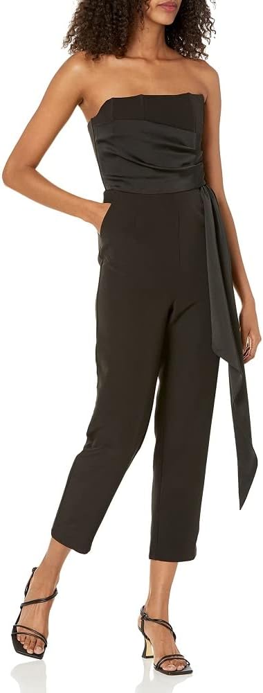 Next level. The Harlan Jumpsuit is a satin back crepe one-piece. She features a strapless neckline and a wrap belt detail for a cinched-waist silhouette.