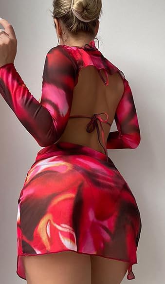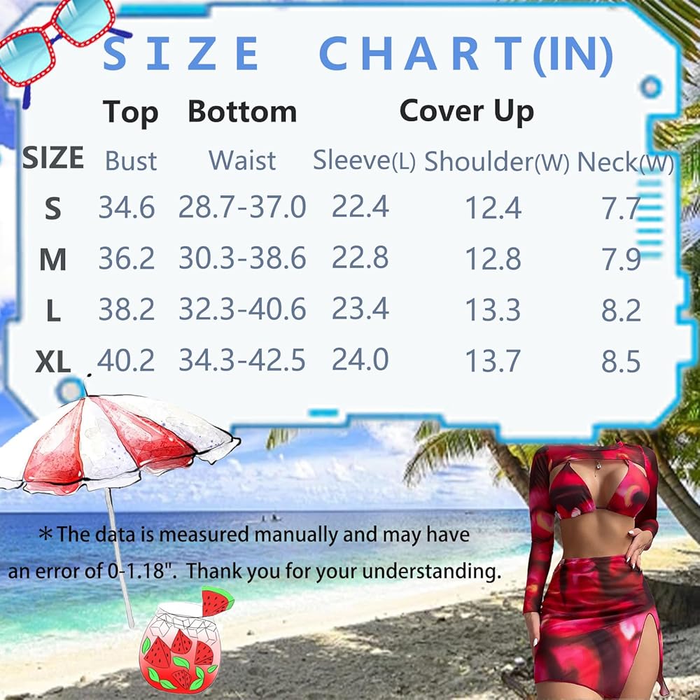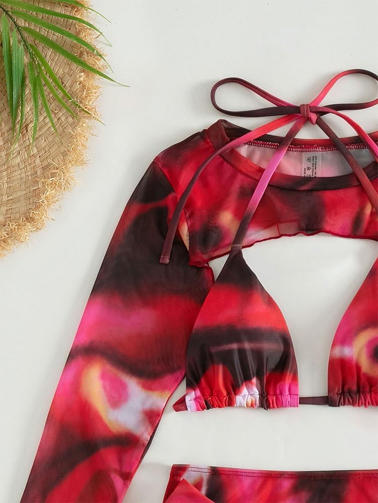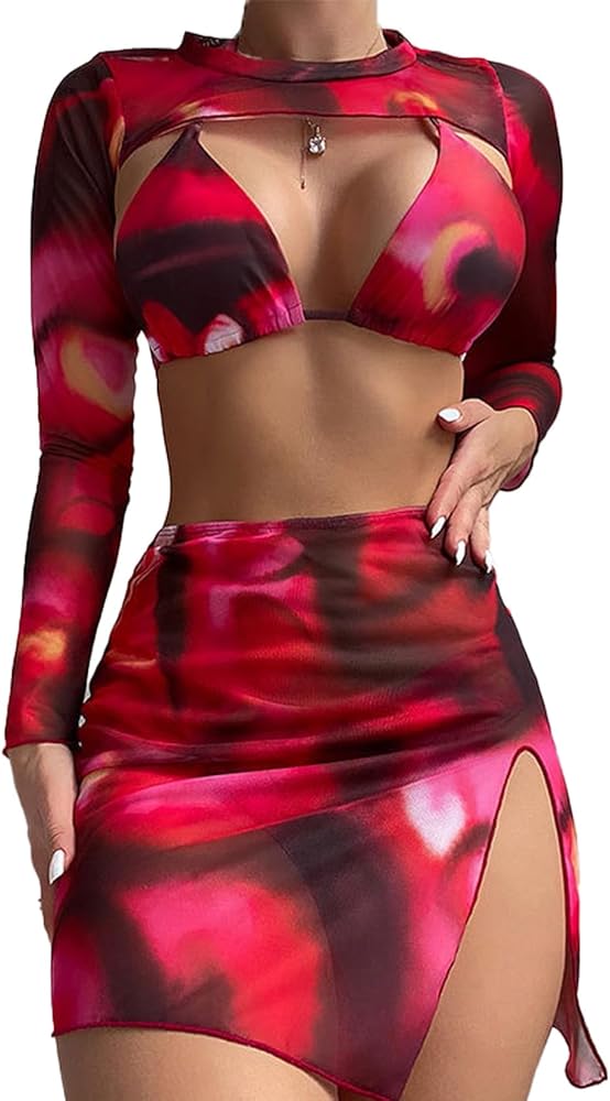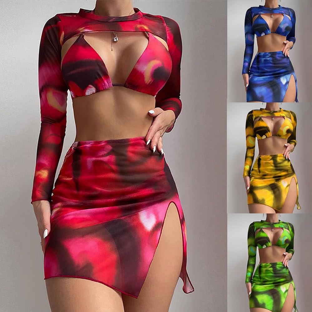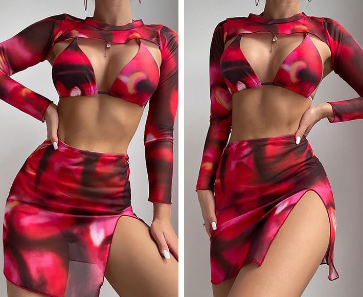 【طقم بيكيني مكون من 4 قطع مع غطاء】طقم البكيني هذا مع بلوزة قصيرة مجوفة بأكمام طويلة وتنورات قصيرة عالية الانقسام. غطاء بأكمام طويلة يمنعك من أضرار الأشعة فوق البنفسجية. تُظهر البيكيني الأنيقة والمثيرة منحنيات جسمك الجميلة، وتجعلك تبدين لامعة وساحرة حول الشاطئ أو أي مكان آخر لقضاء العطلة.