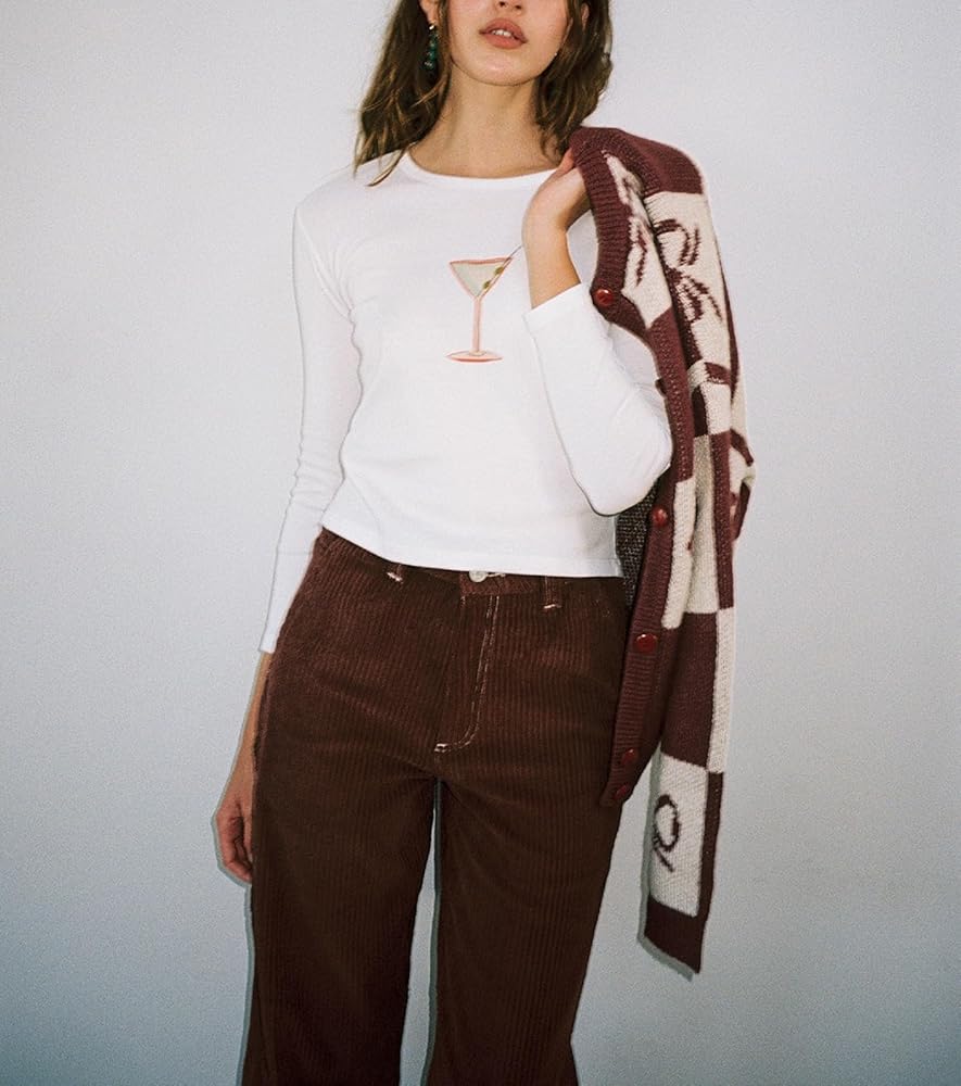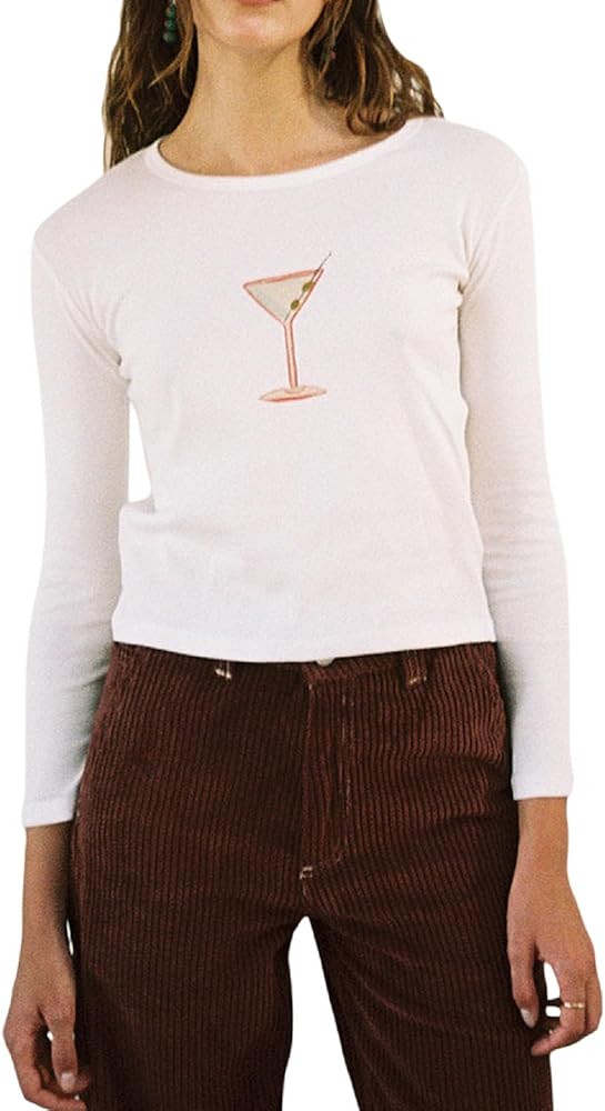 Design: Women long sleeve fruit print chic tops, crew neck slim fit tee, cute tomato, cake, cherry, bow print fashion shirts, colorful patterned tops, spring fall teen tees, lady going out tops.