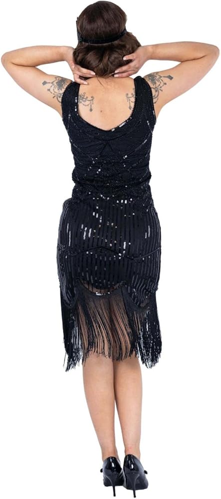 فستان مبطن بالكامل يتميز بطبقة خارجية من الشبك مع الترتر والشرابات