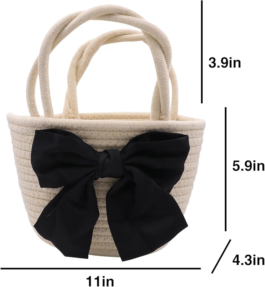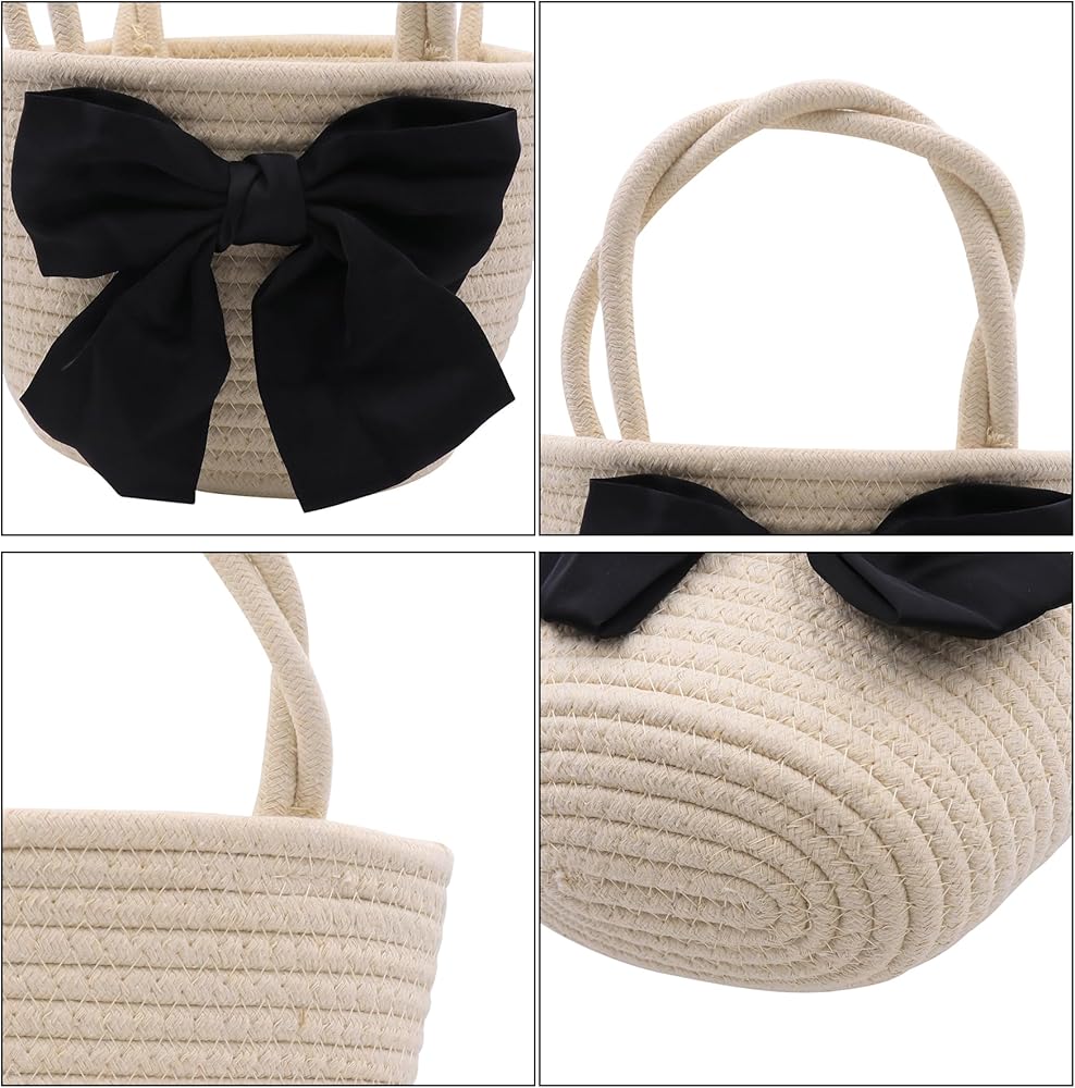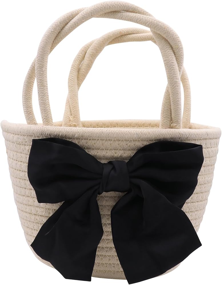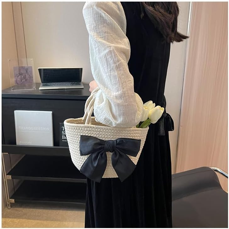 تصميم الموضة: حقيبة منسوجة مع زخرفة على شكل فيونكة سوداء كبيرة، عصرية مع القليل من المرح، النمط هو تصميم دلو، سعة كبيرة، عصرية ومتعددة الاستخدامات، ويمكن مطابقتها مع ملابس مختلفة.