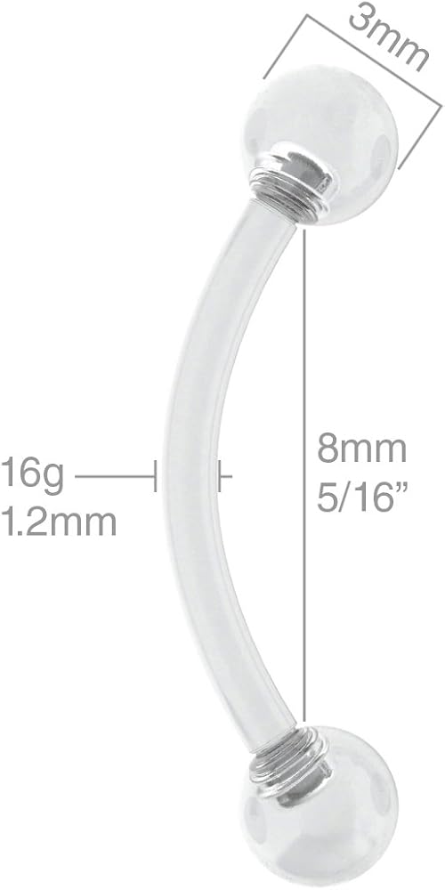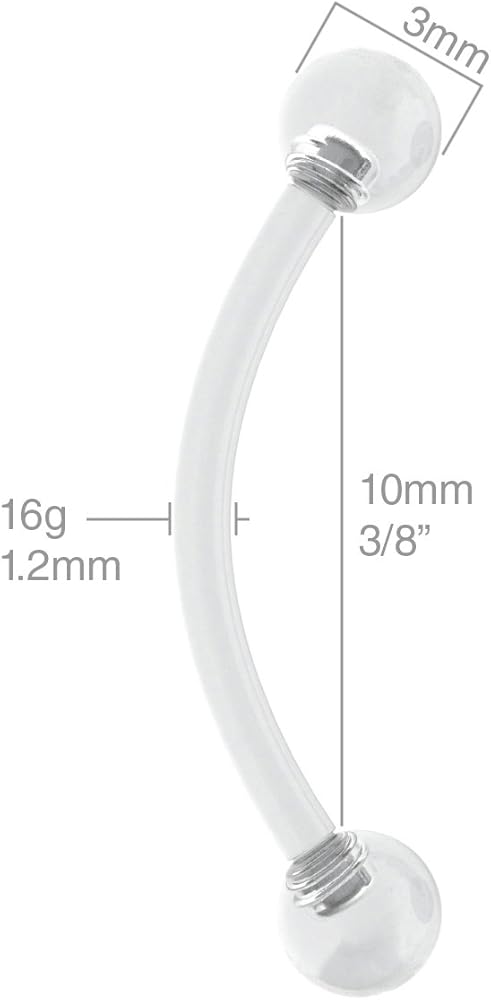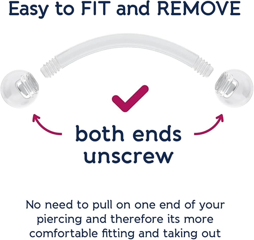 PIERCING STYLE - These curved plastic barbell can be used for anti-tragus, conch, triple forward helix, helix, lobe, rook, tragus, transverse lobe, triple forward helix, vertical labret, vertical tragus piercings. The ball-ends of these curved plastic barbell screw on easily and can be securely fastened to prevent falling off. piercings. This bulk lot pack set contains 8 x clear curved barbell