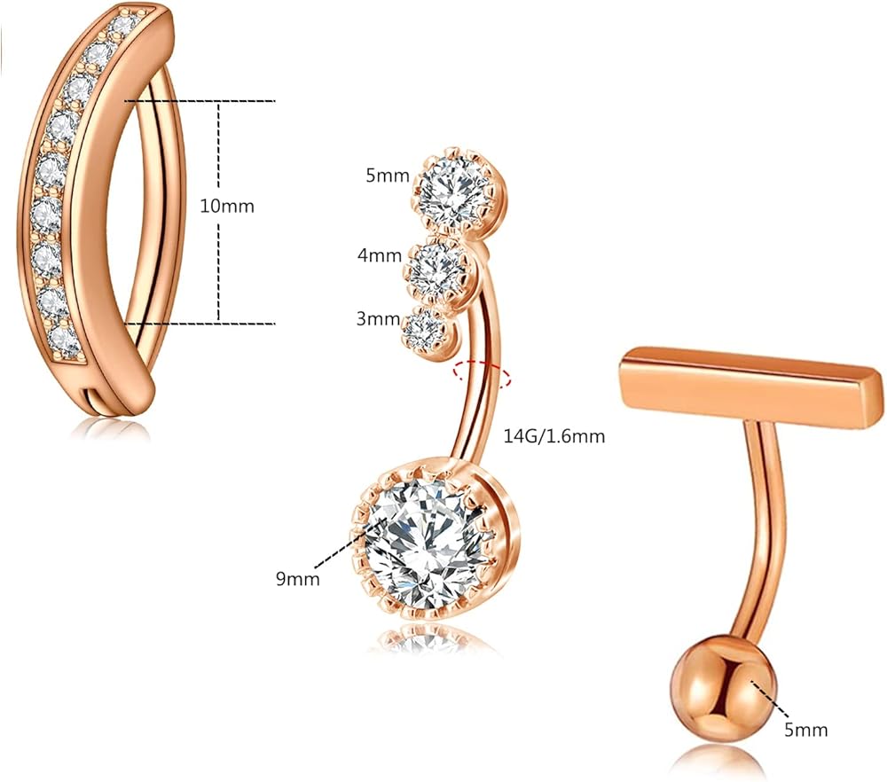 تصميم بسيط: سوف تحصل على 4 قطع من حلقات البطن بأشكال مختلفة. بما في ذلك قطعتين من حلقات زر البطن، قطعة واحدة من حلقة زر البطن الصغيرة، قطعة واحدة من حلقة السرة المكعبة من الزركونيا. حلقات البطن مدمجة بمواد صحية وتصميم إغلاق مفصلي عملي للغاية، مشبك من قطعة واحدة قابل للإزالة بسهولة. صنع حلقات زر البطن للفتح والإغلاق دون أي صعوبة، يزيل تلك الكرات الصغيرة التي يصعب التعامل معها.