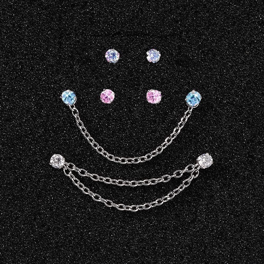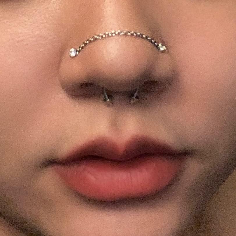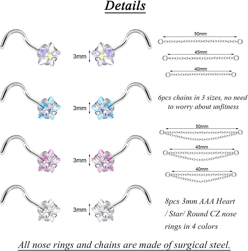 • ✿[Total 14Pcs]: 8Pcs nose studs and 6pcs nose chains, the chains made of 316l stainless steel too. 6Pcs chains in 2 styles with 40/45/50mm, suitable for women men.