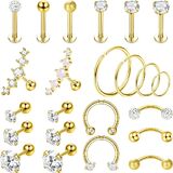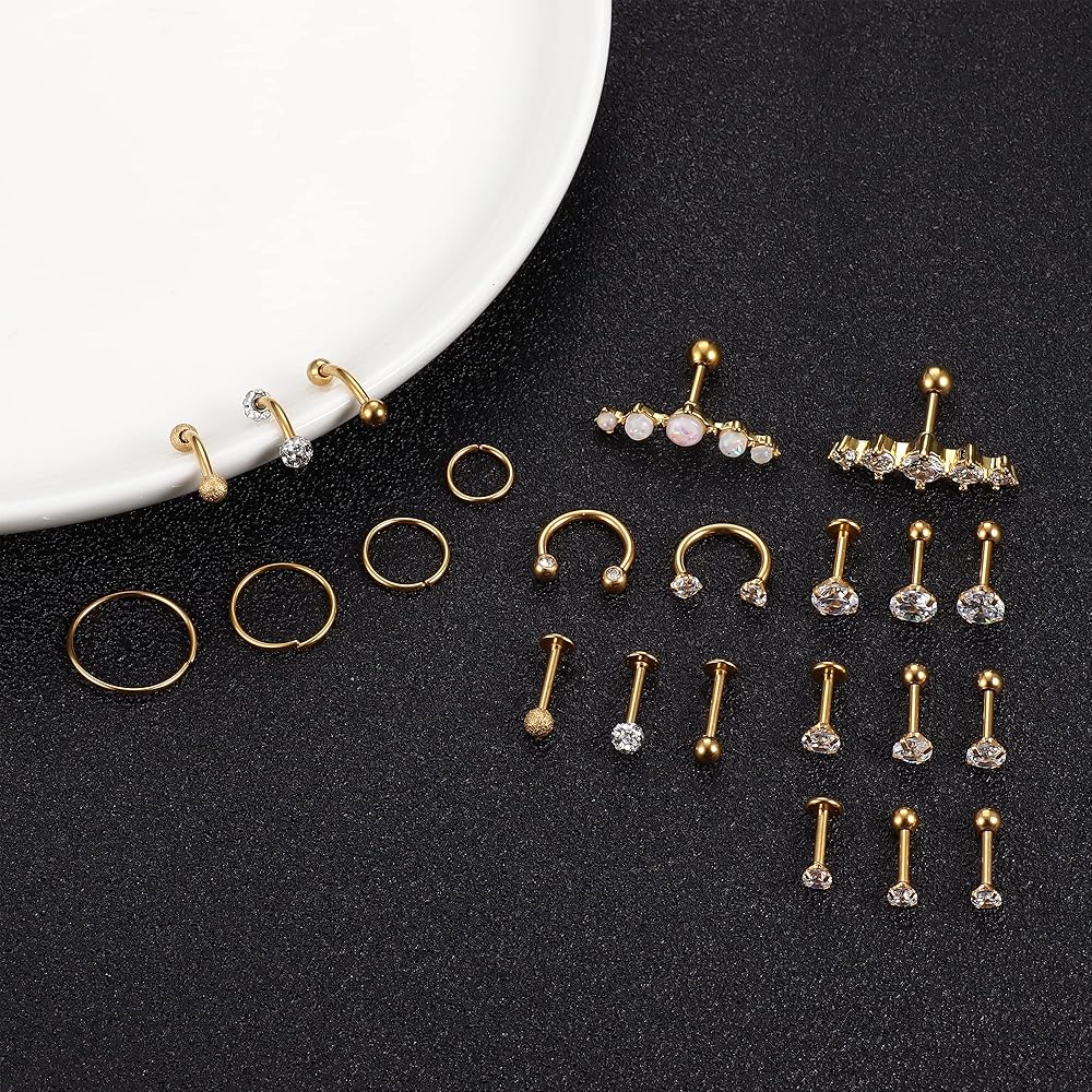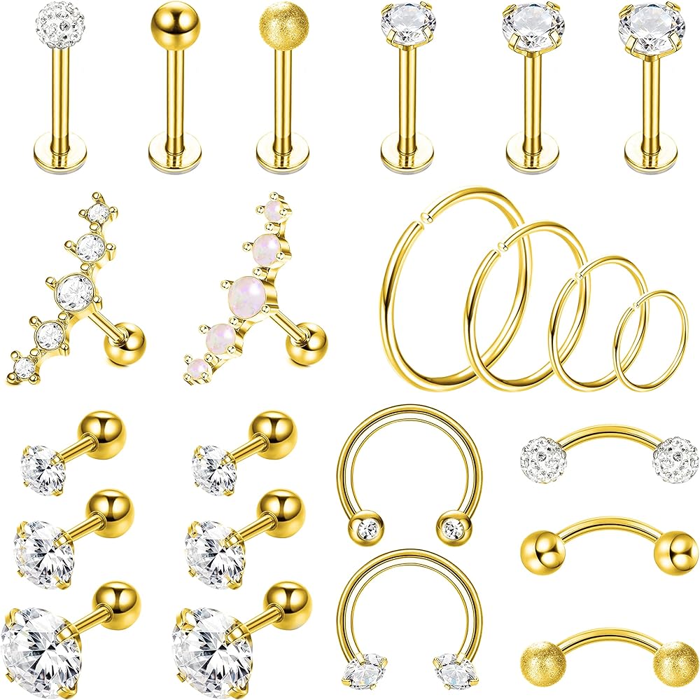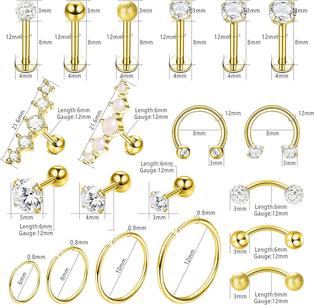 23 قطعة من أقراط الغضروف ذات اللون الذهبي: 3 أزواج من أقراط الغضروف + 4 قطع من أقراط الغضروف + 3 قطع من مجوهرات ثقب الحلزون الأمامي + 3 قطع مجوهرات ثقب الزنمة + 3 قطع مجوهرات ثقب الرخ + 2 قطعة مجوهرات ثقب دايث + 2 قطعة مجوهرات ثقب القوقع، مجوهرات ثقب الأذن المثالية للنساء والرجال رجال