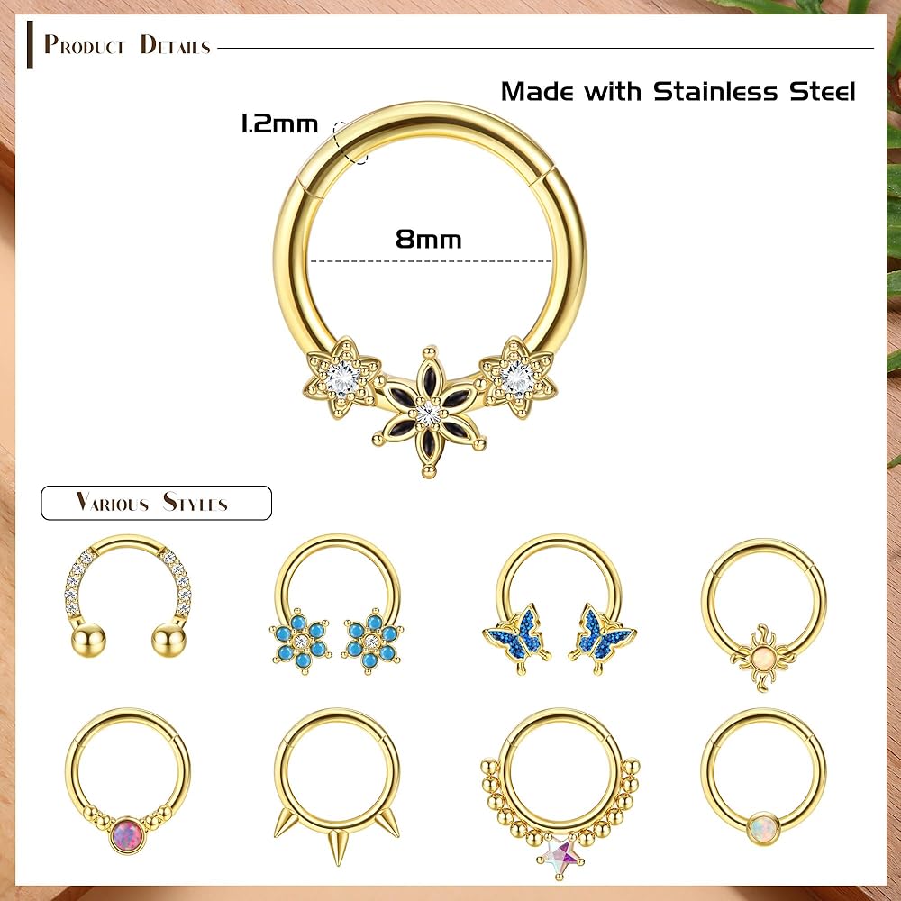 سهلة الاستخدام - التصميم السلس لحلقات الحاجز الأوبال يجعل من السهل الفتح والإغلاق ويسمح بتركيب آمن على الأنف، مما يضمن عدم سقوطها بسهولة. حجم المقياس: 1.2 مللي متر = 16 جرام. قطر الحلقات: 8 ملم.