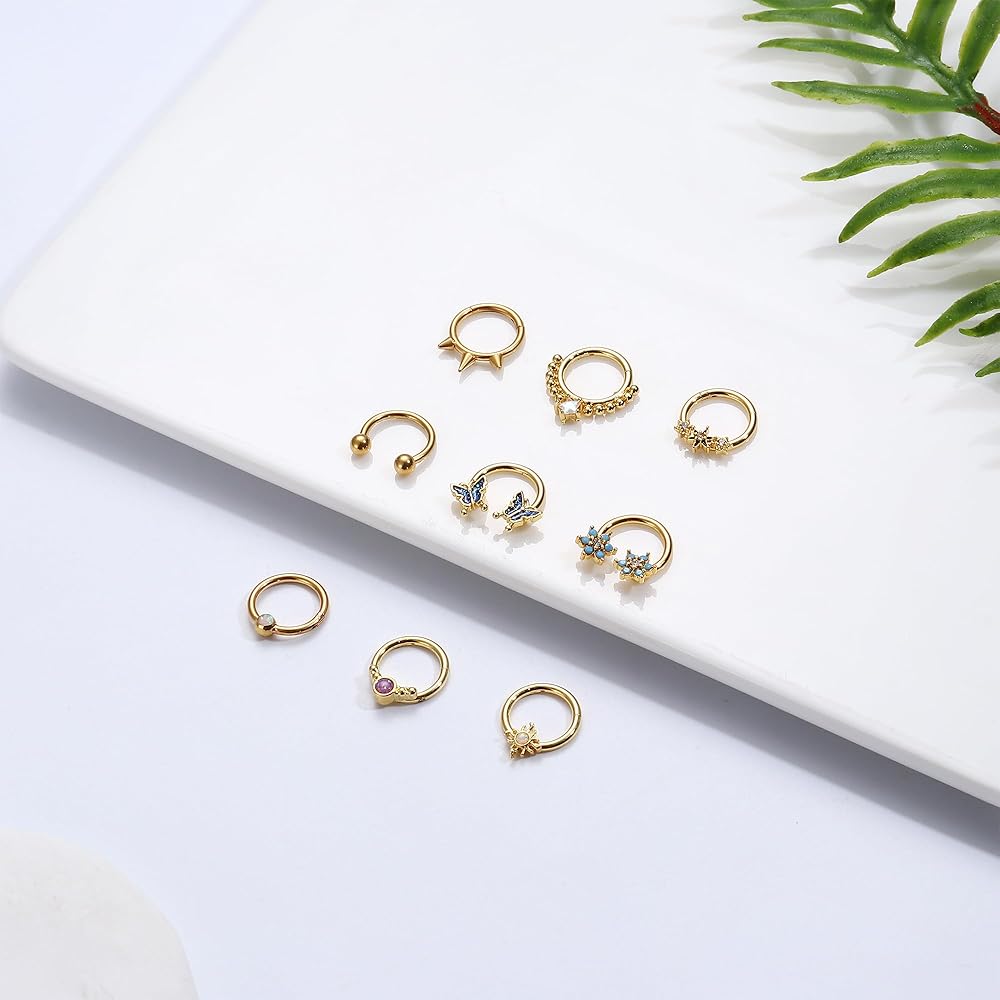 حلقات حاجز فريدة من نوعها - 9 قطع من حلقات الحاجز بتصميمات مختلفة متوفرة باللونين الفضي والذهبي. تُعد حلقات الحاجز الذهبية هذه المصنوعة بشكل جميل مثالية لإضافة لمسة من الأناقة والرقي إلى أي ملابس ومن المؤكد أنها ستضفي لمسة جريئة على الموضة.