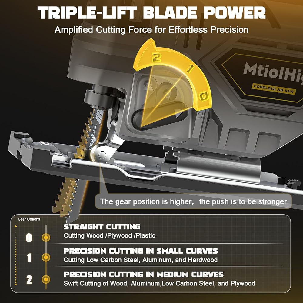 • 【التحكم في السرعة والأمان】قم بتخصيص سرعة القطع حسب احتياجاتك من خلال مفتاح الزناد المتغير السرعة الموجود على مناشير MtiolHig Power Jig. بالإضافة إلى ذلك، يمنع زر القفل عمليات التشغيل غير المقصودة، مما يضمن التشغيل الآمن وإعطاء الأولوية للسلامة طوال مشروعاتك.