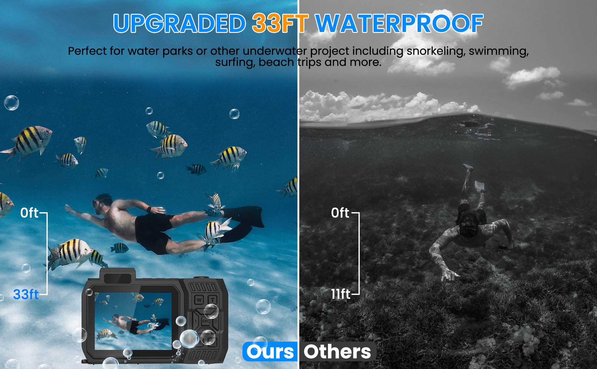 • 【الغوص في أعماق 33 قدمًا】الغوص بلا خوف في العالم تحت السطح مع تصنيف مقاوم للماء يصل إلى 33 قدمًا (10 أمتار). تضمن لك هذه الكاميرا المقاومة للماء التقاط لحظات مذهلة أثناء المغامرات تحت الماء، مما يجعلها الرفيق المثالي للغطس والغوص وأنشطة الشاطئ.