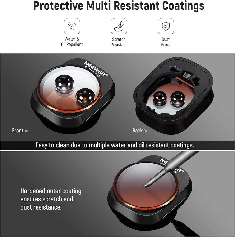 【استنساخ ألوان زاهية وحماية للعدسة】 تحسين جودة التصوير من خلال عرض الألوان الممتاز الذي يحققه مرشح CPL المتضمن. يساعد على تقليل الوهج والانعكاسات غير السارة من الأسطح مثل الماء والزجاج والأشياء غير المعدنية الأخرى. كما يمنحك مرشح الأشعة فوق البنفسجية درجات أكثر حيوية أثناء التصوير ويحمي عدستك الثمينة من التلف، مثل الخدوش والغبار والأشعة فوق البنفسجية الضارة