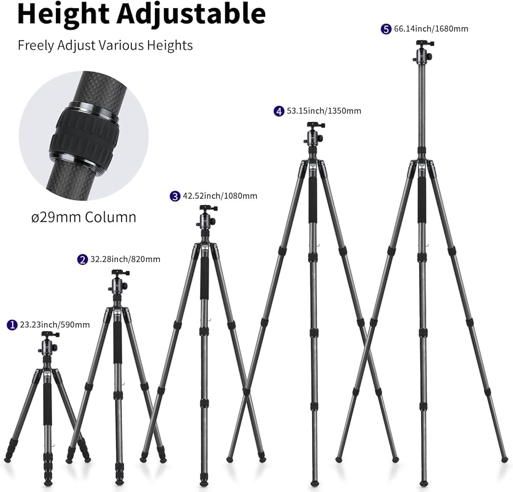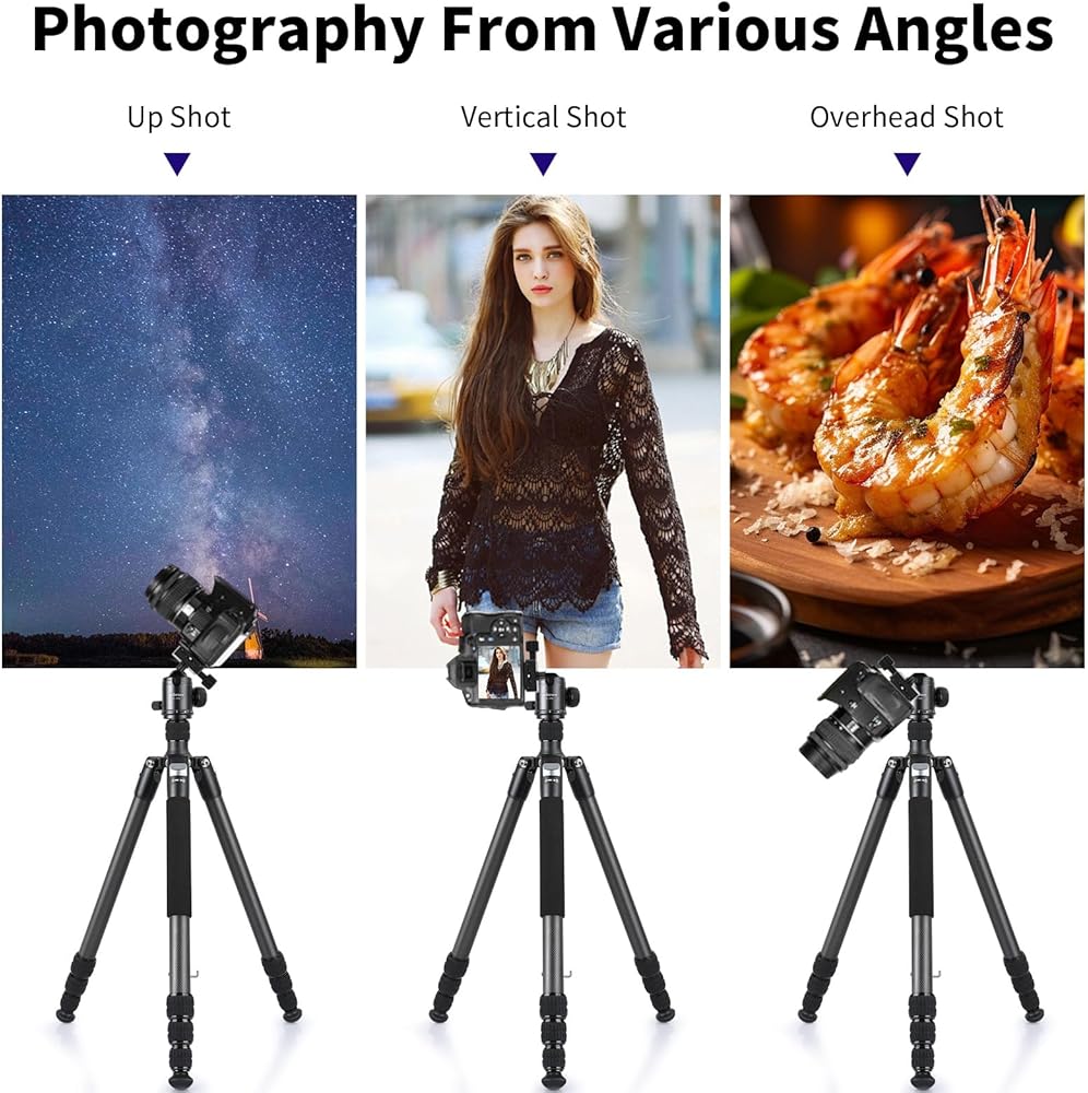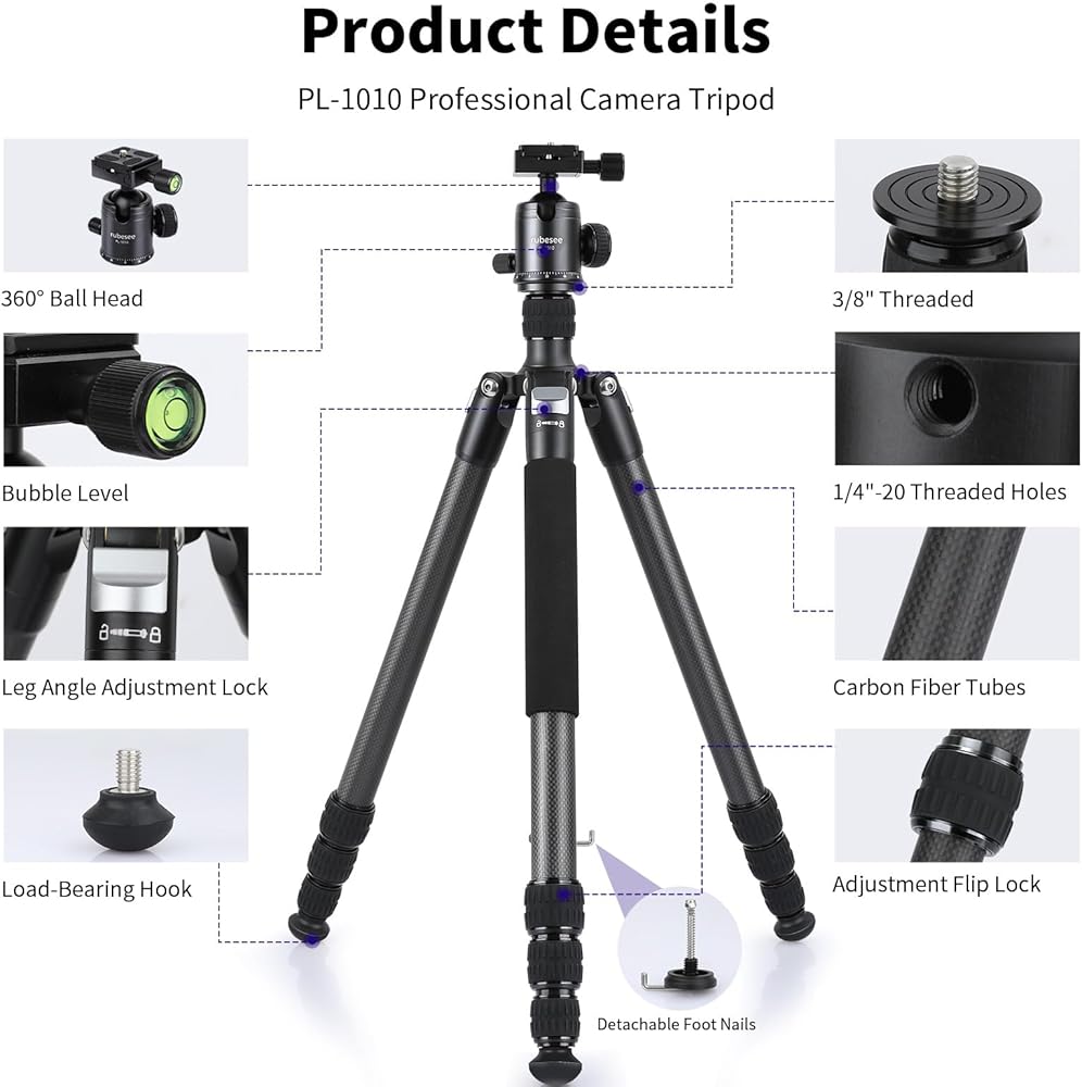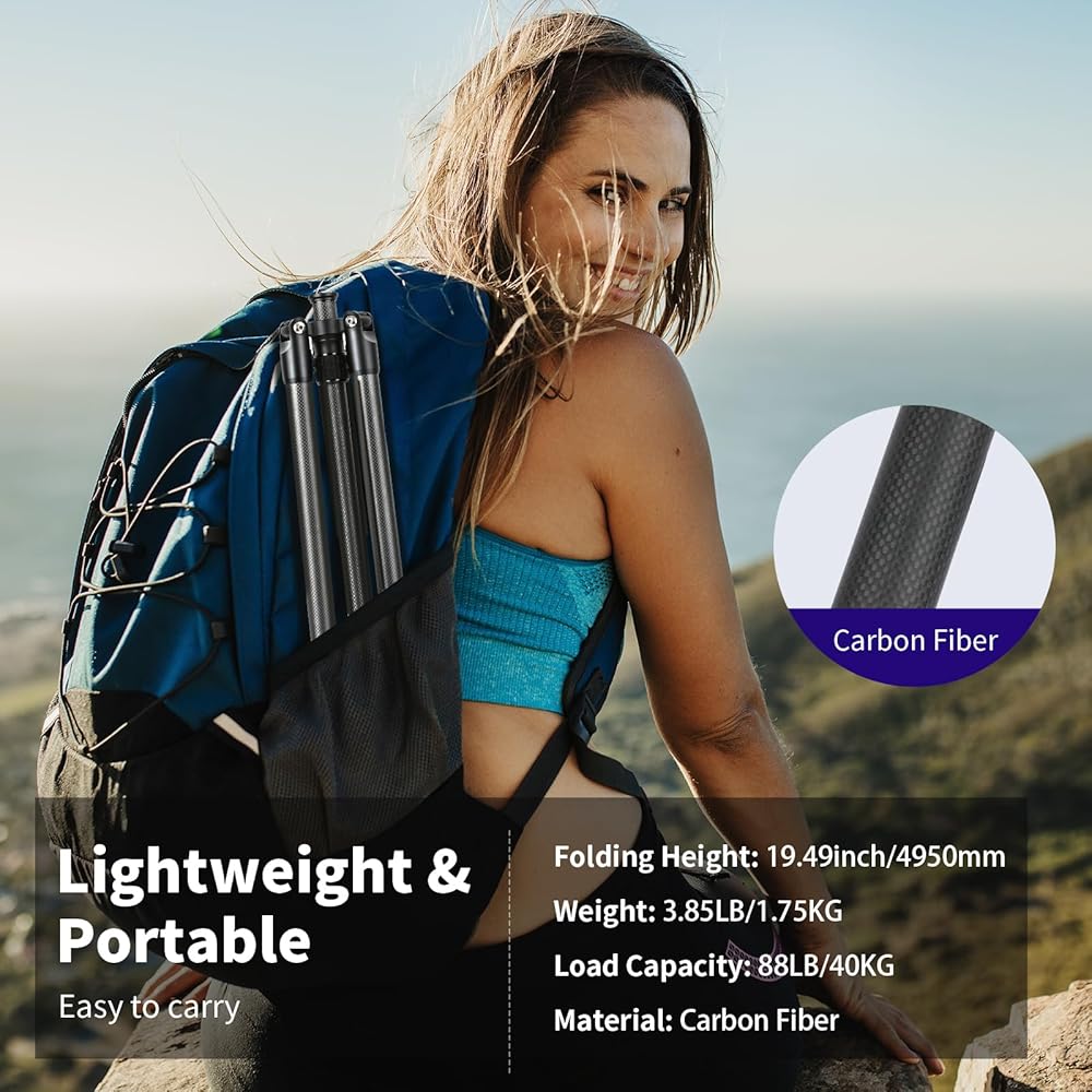 توافق واسع مع مسمار 1/4 بوصة: تم تصميم حامل ثلاثي القوائم للسفر بلوحة سريعة التحرير 1/4 بوصة وفتحات لولبية إضافية 1/4 بوصة للتوافق الواسع مع Canon Nikon Sony DSLRs وكاميرات الفيديو والكاميرات الرياضية والكاميرات التي لا تحتوي على مرايا، أيضًا حيث يتم تركيب الهاتف المحمول بفتحات براغي ملولبة مقاس 1/4 بوصة (حوامل الهاتف المحمول غير متضمنة) والمزيد. هيكل من ألياف الكربون يجعلها مدمجة وخفيفة الوزن. من السهل حمل الحامل ثلاثي القوائم للتصوير الفوتوغرافي أثناء التنقل