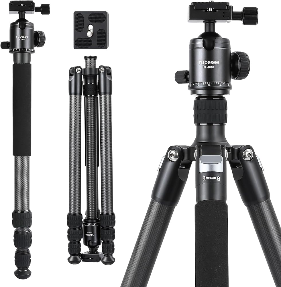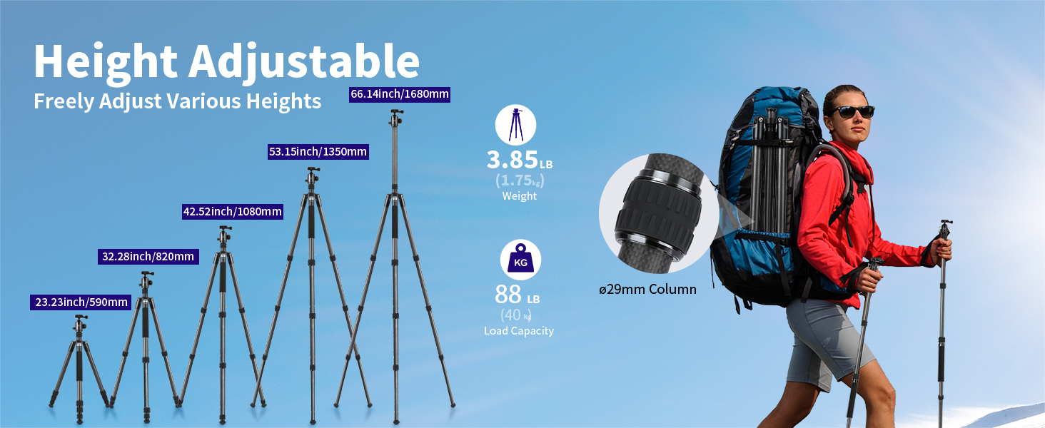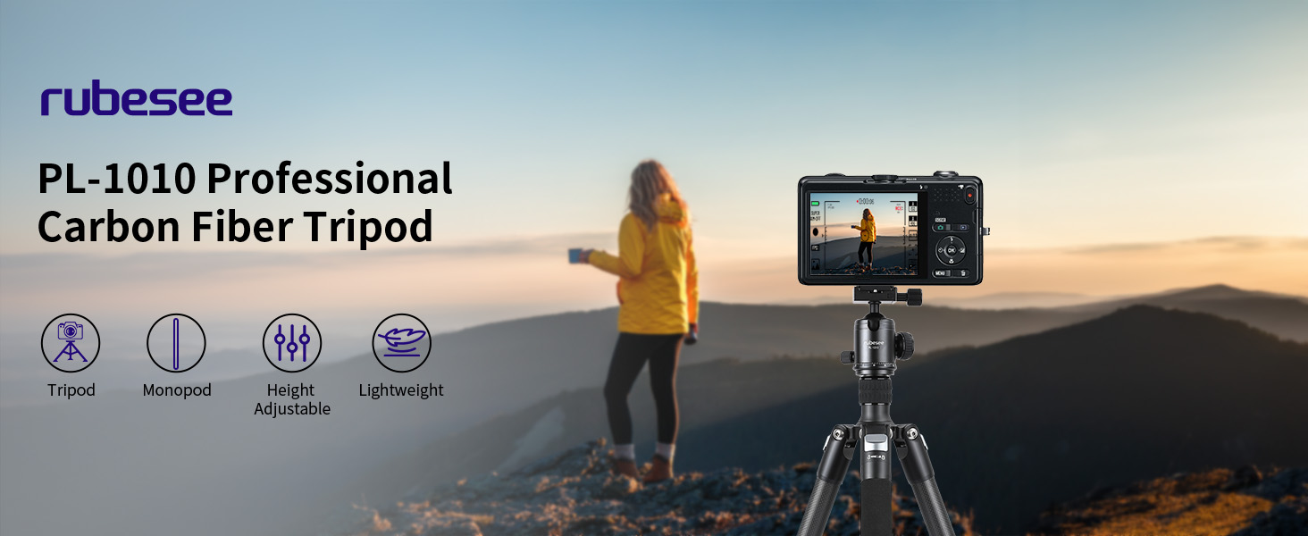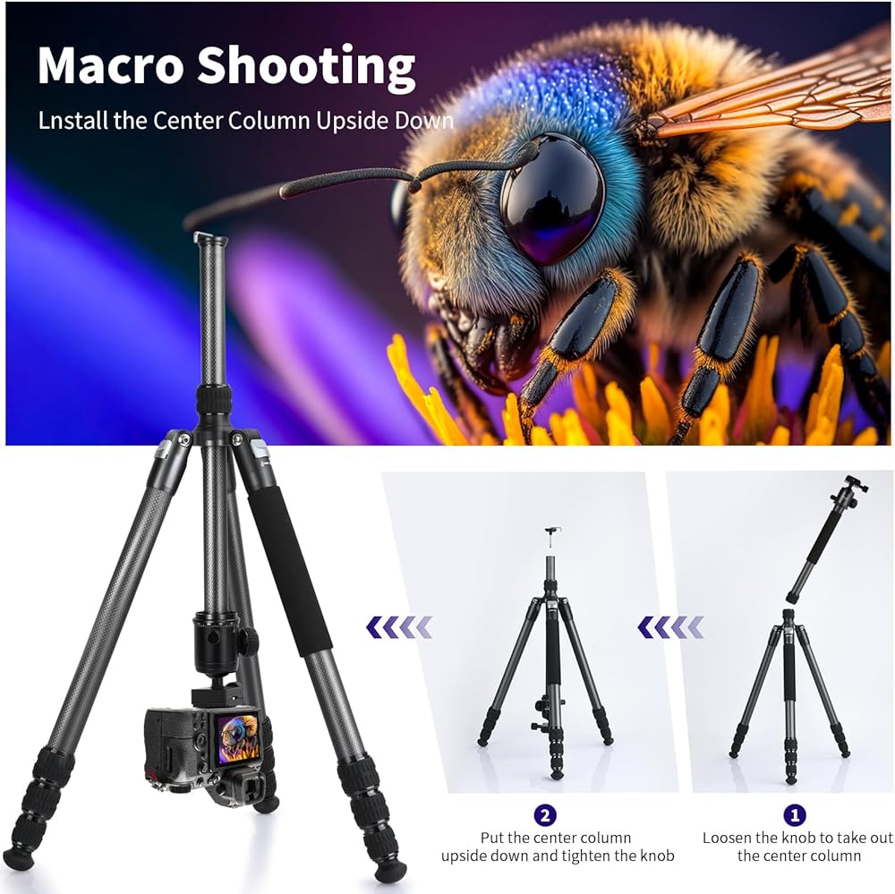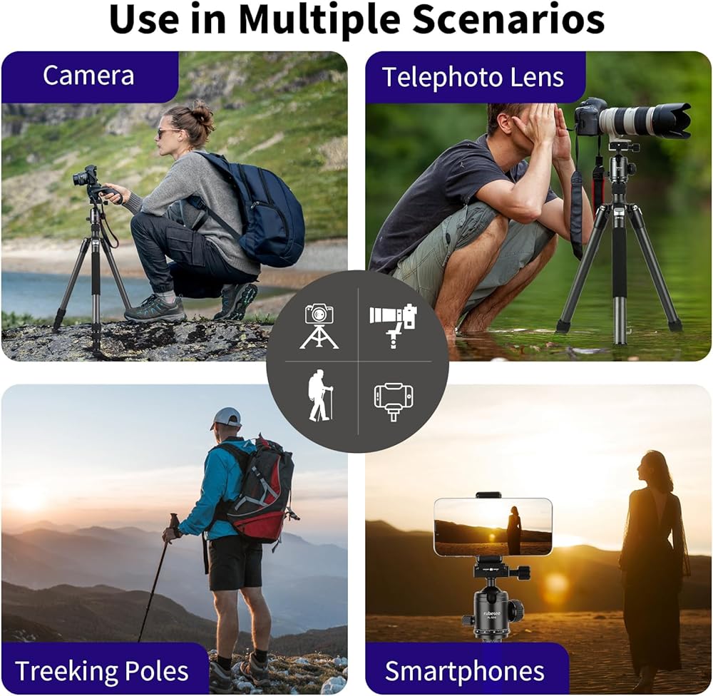 توافق واسع مع مسمار 1/4 بوصة: تم تصميم حامل ثلاثي القوائم للسفر بلوحة سريعة التحرير 1/4 بوصة وفتحات لولبية إضافية 1/4 بوصة للتوافق الواسع مع Canon Nikon Sony DSLRs وكاميرات الفيديو والكاميرات الرياضية والكاميرات التي لا تحتوي على مرايا، أيضًا حيث يتم تركيب الهاتف المحمول بفتحات براغي ملولبة مقاس 1/4 بوصة (حوامل الهاتف المحمول غير متضمنة) والمزيد. هيكل من ألياف الكربون يجعلها مدمجة وخفيفة الوزن. من السهل حمل الحامل ثلاثي القوائم للتصوير الفوتوغرافي أثناء التنقل