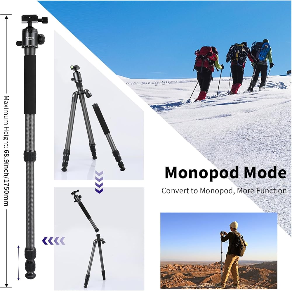 حامل ثلاثي/أحادي سهل التحويل: حامل ثلاثي الأرجل/أحادي الأرجل الاحترافي في تصميم واحد مريح للغاية عند التصوير في الهواء الطلق، خاصة للتصوير الفوتوغرافي أثناء السفر. عند الشعور بالتعب، يمكنك إزالة العمود الأوسط بسرعة، وفصل أحد أرجل الحامل ثلاثي القوائم، وتوصيلهما ليصبح حامل ثلاثي القوائم قابل للإزالة أو عصا مشي يصل ارتفاعها إلى 68.9 بوصة/175 سم، ويأتي مع حقيبة حمل، مريحة للغاية ليحمل