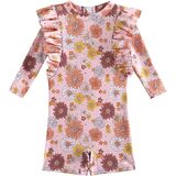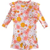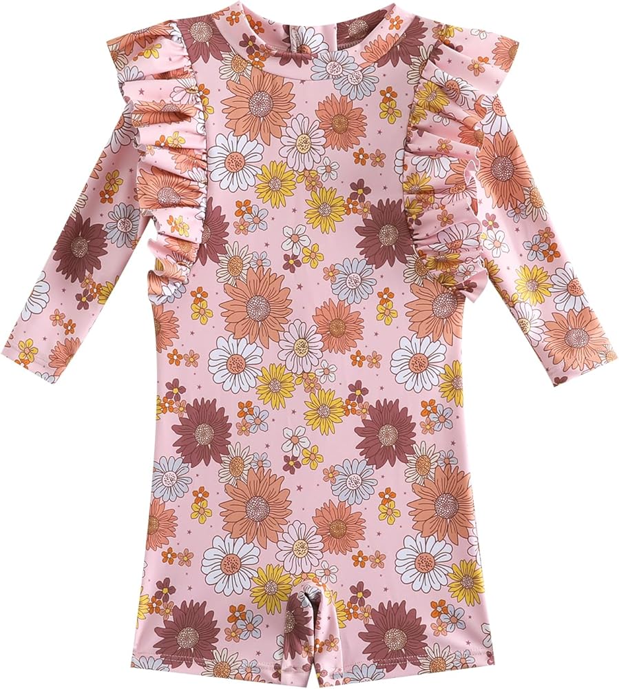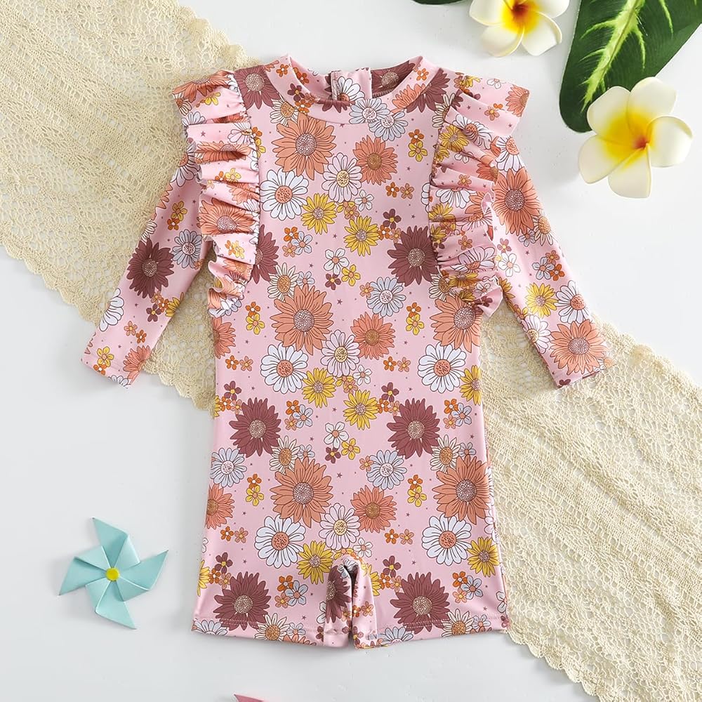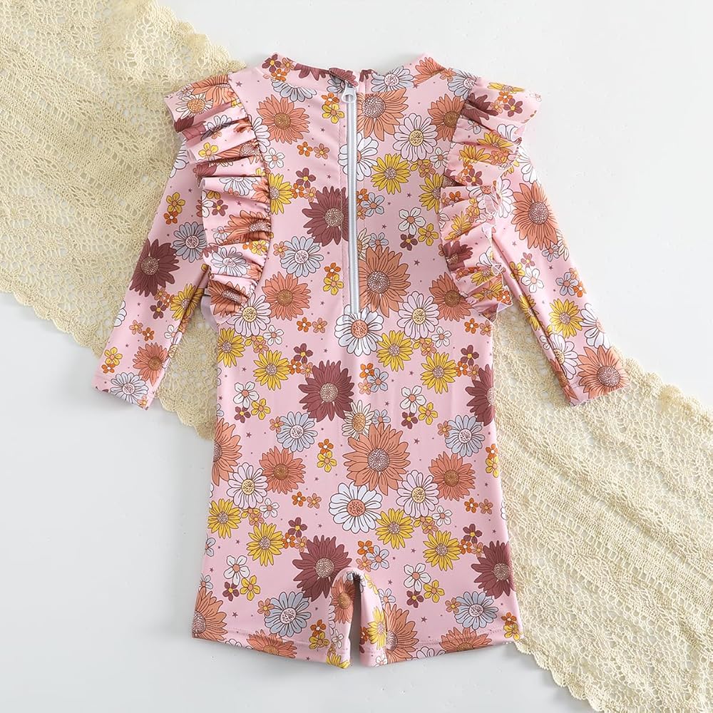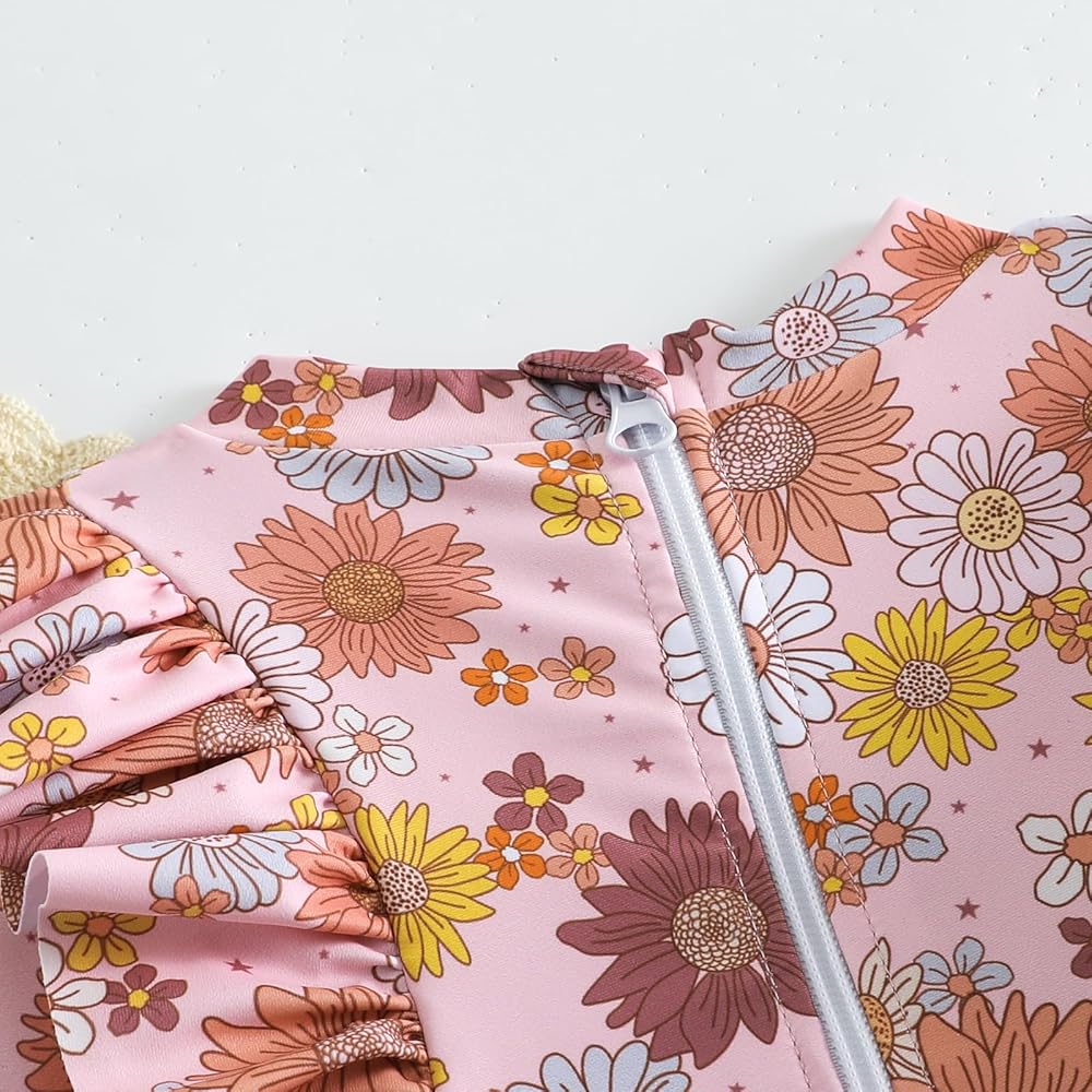 [Design]: Vintage baby girl floral print swimsuit. long sleeve ruffle bathing suit baby girls.This rash guard swimwear features a convenient zip for easy dressing. The design ensures skin protection, with zipper flap and garage, shielding your baby's delicate skin. This infant baby girls flower Printed swimsuit is cute, trendy and comfortable to wear. It is an ideal choice for baby girls' swimwear.