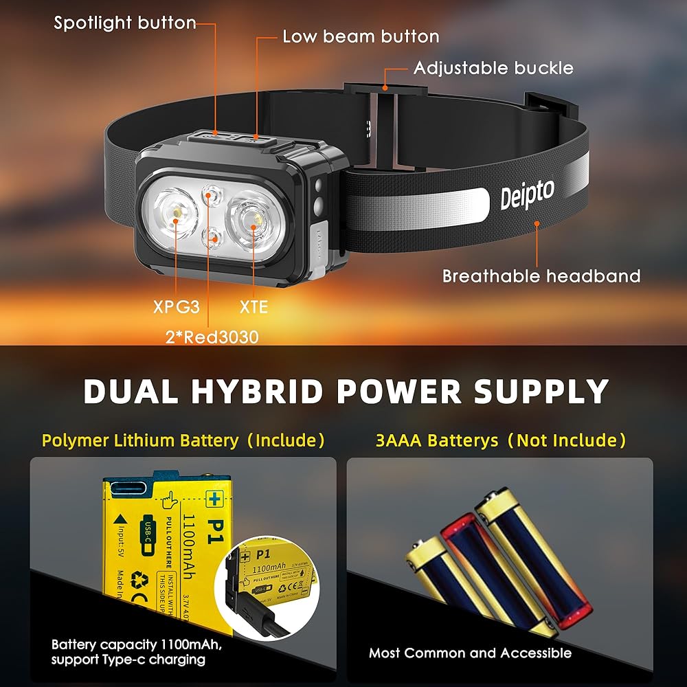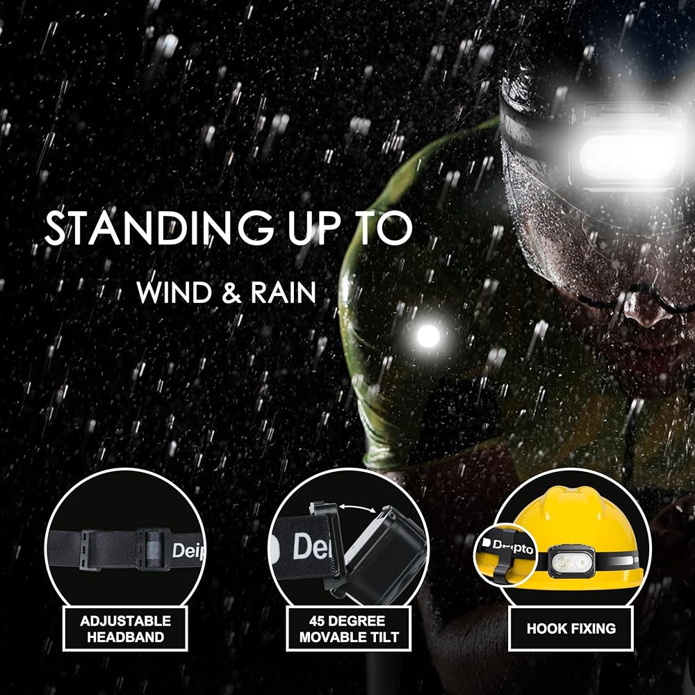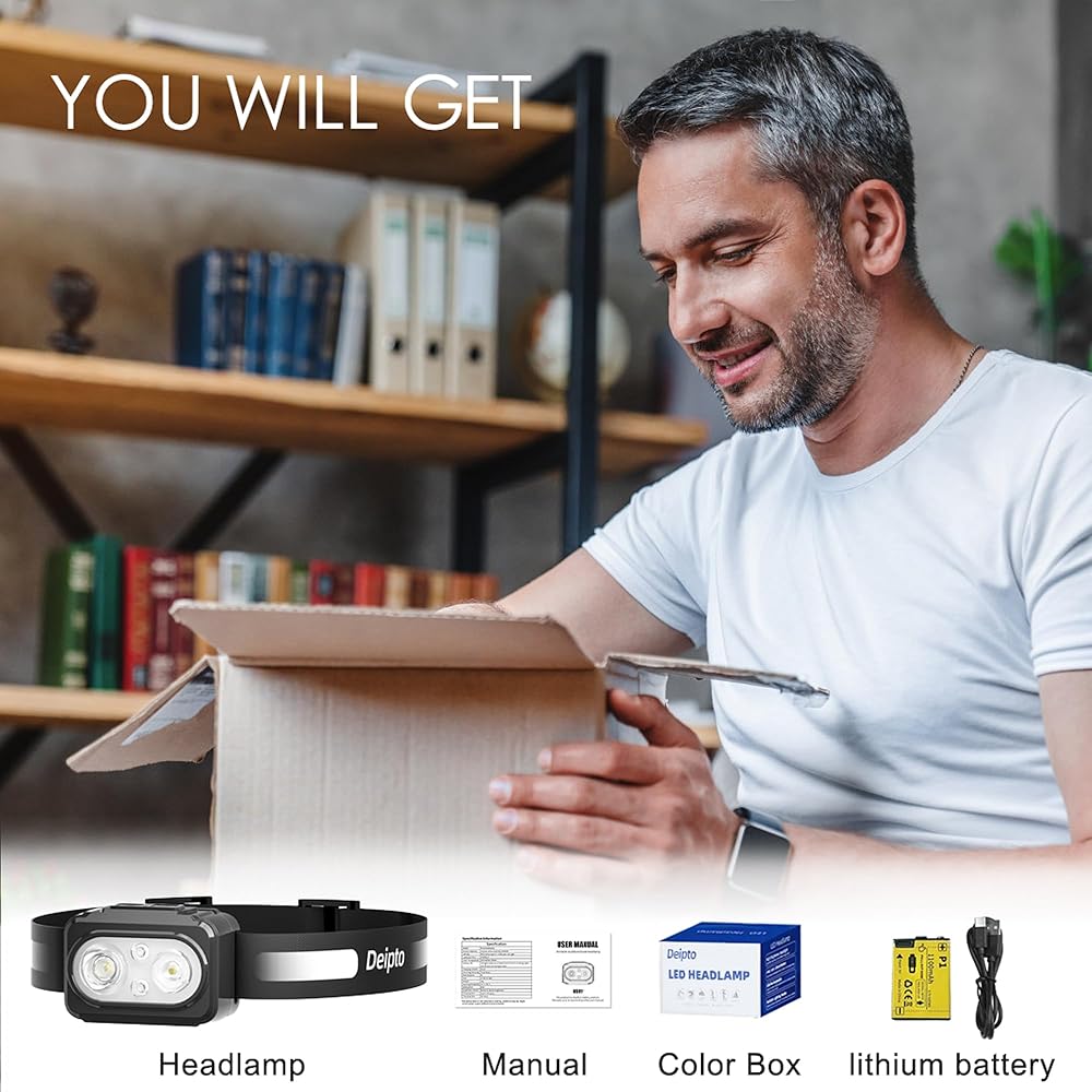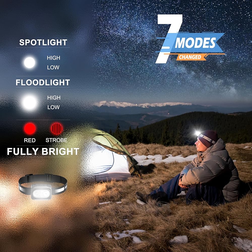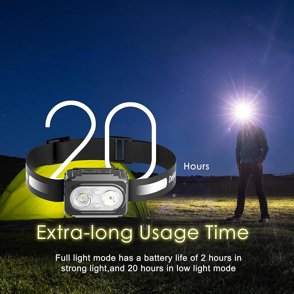 مصباح أمامي LED من Deipto قابل لإعادة الشحن، مصباح رأس 400 لومن مع 7 أوضاع، مصباح أمامي خفيف مقاوم للماء IPX3 للجري والتخييم والخارج والعمل (البطاريات متضمنة)