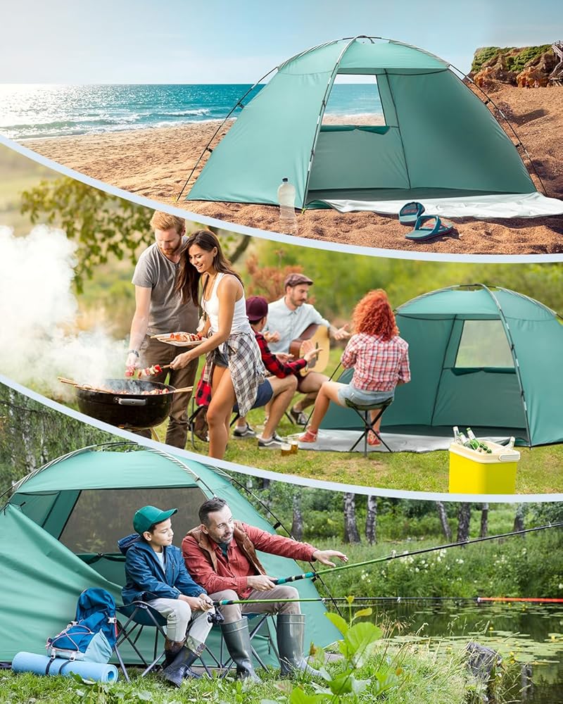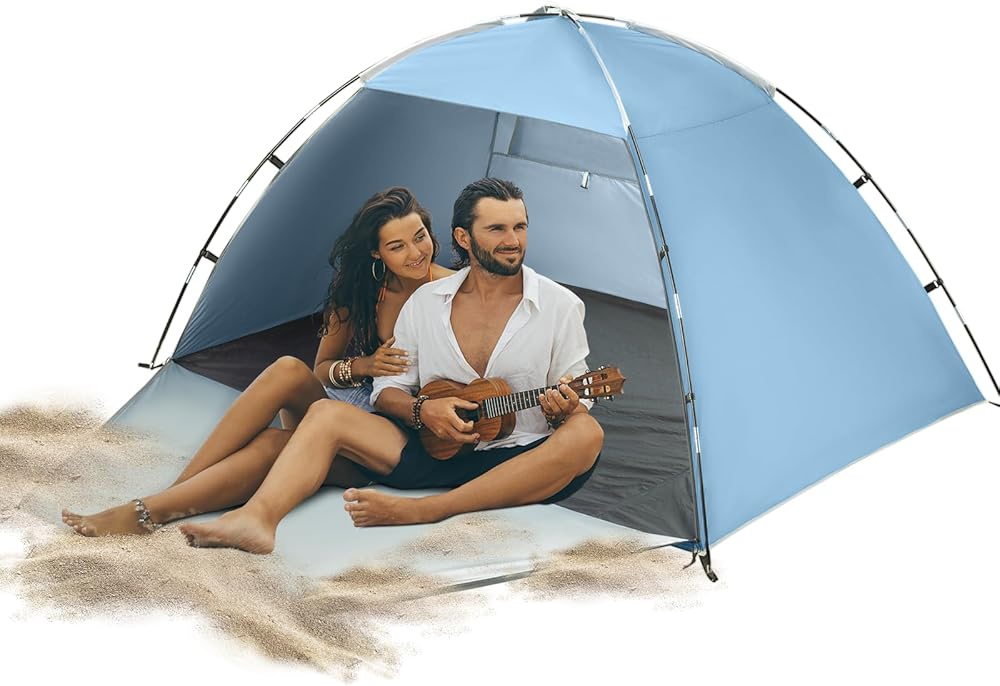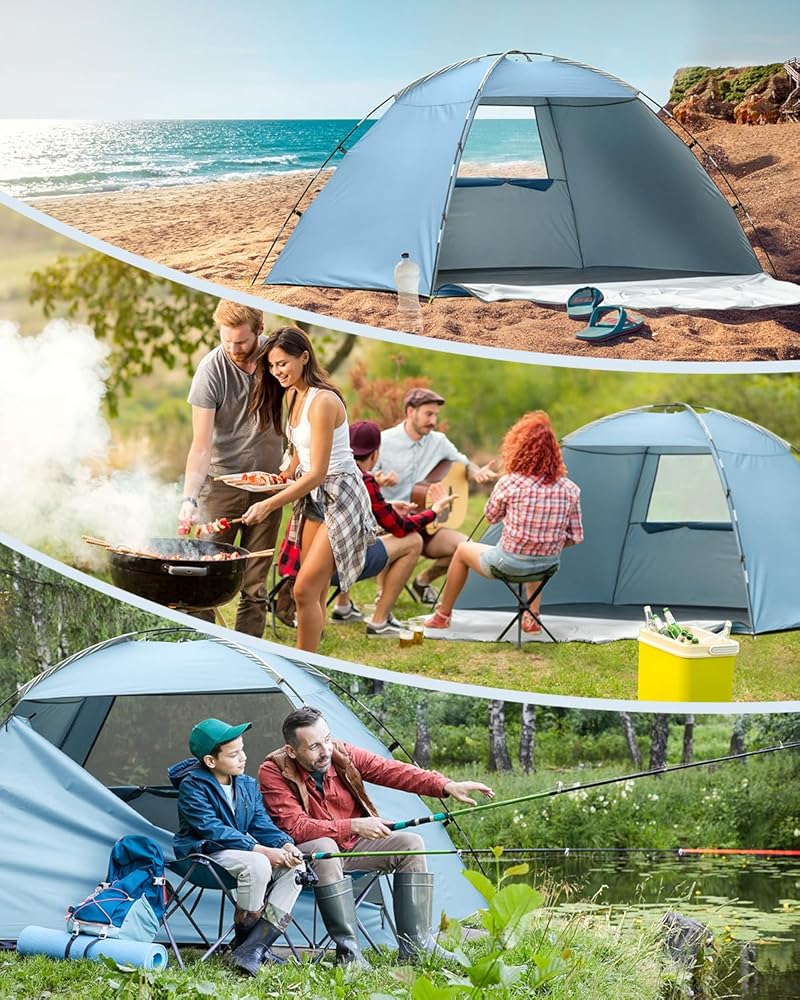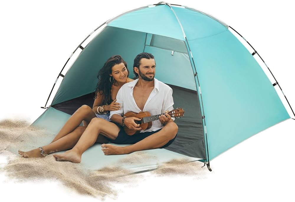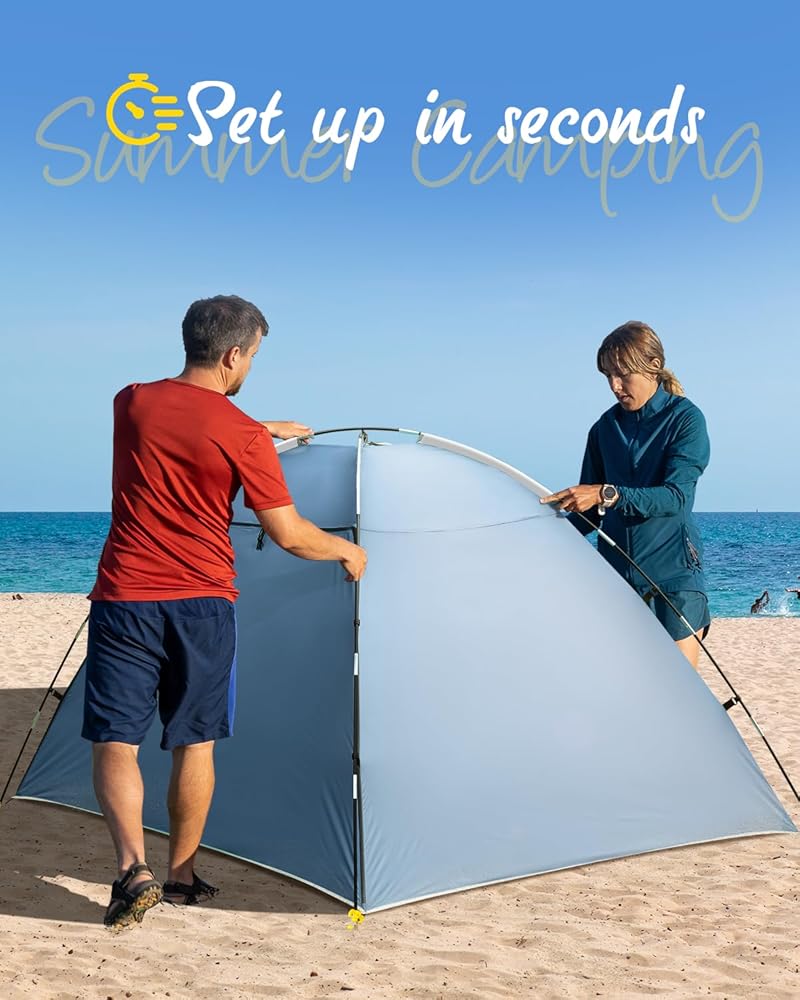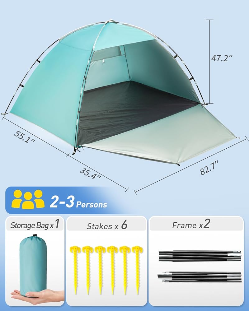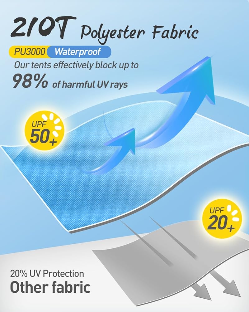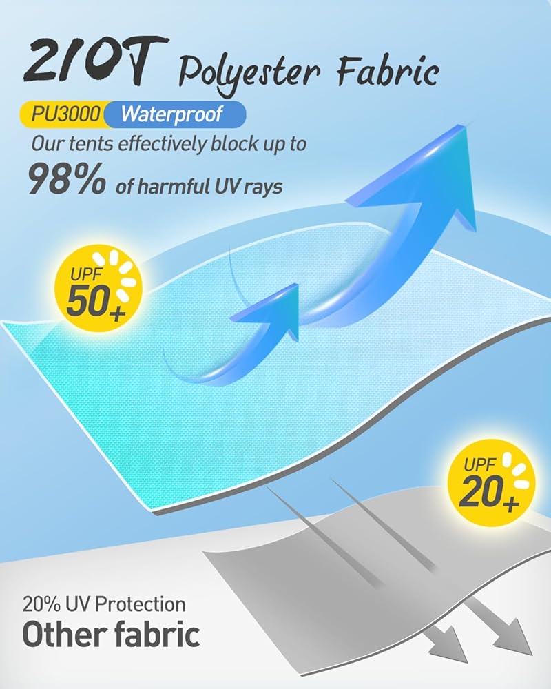 🏖️ مقاوم للماء والأشعة فوق البنفسجية: الجزء الداخلي مغطى بطبقة فضية للحماية من أشعة الشمس، بينما يوفر نسيج البوليستر 210T المقاوم للماء حماية مؤقتة في المطر. يمكن لعامل حماية من الأشعة فوق البنفسجية 50+ أن يحجب ما يصل إلى 98% من الأشعة فوق البنفسجية الضارة من الشمس ويوفر الحماية لعائلتك على الشاطئ طوال اليوم.