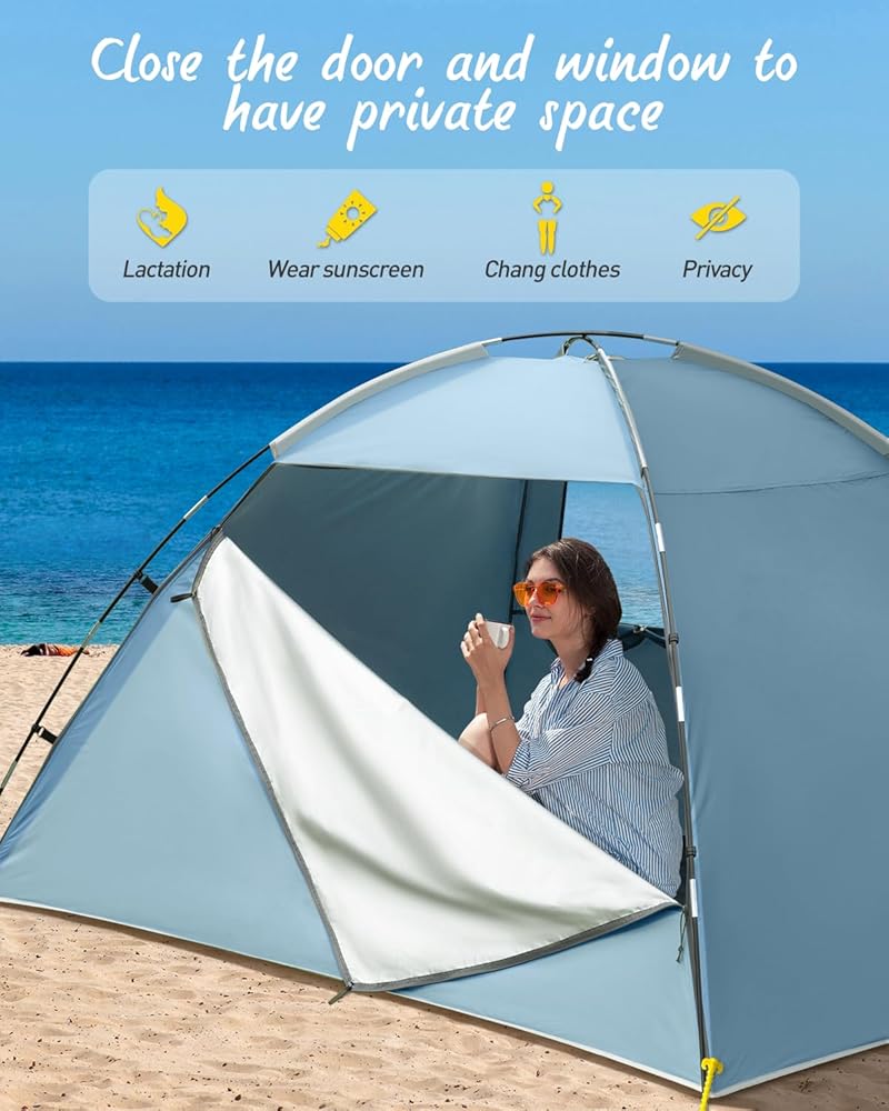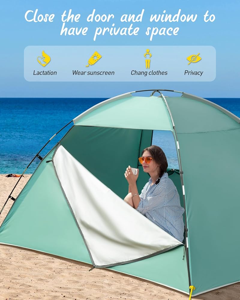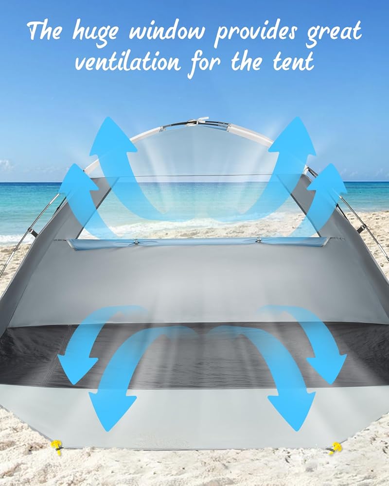 🏡 تهوية ممتازة: خيمة الشاطئ الخاصة بنا مجهزة بنافذة شبكية كبيرة توفر التهوية وبيئة باردة. بالإضافة إلى ذلك، يمكن إغلاق الباب الأمامي والنافذة بالكامل للحصول على مساحة خاصة، حتى تتمكن من تغيير الملابس والرضاعة الطبيعية وما إلى ذلك.