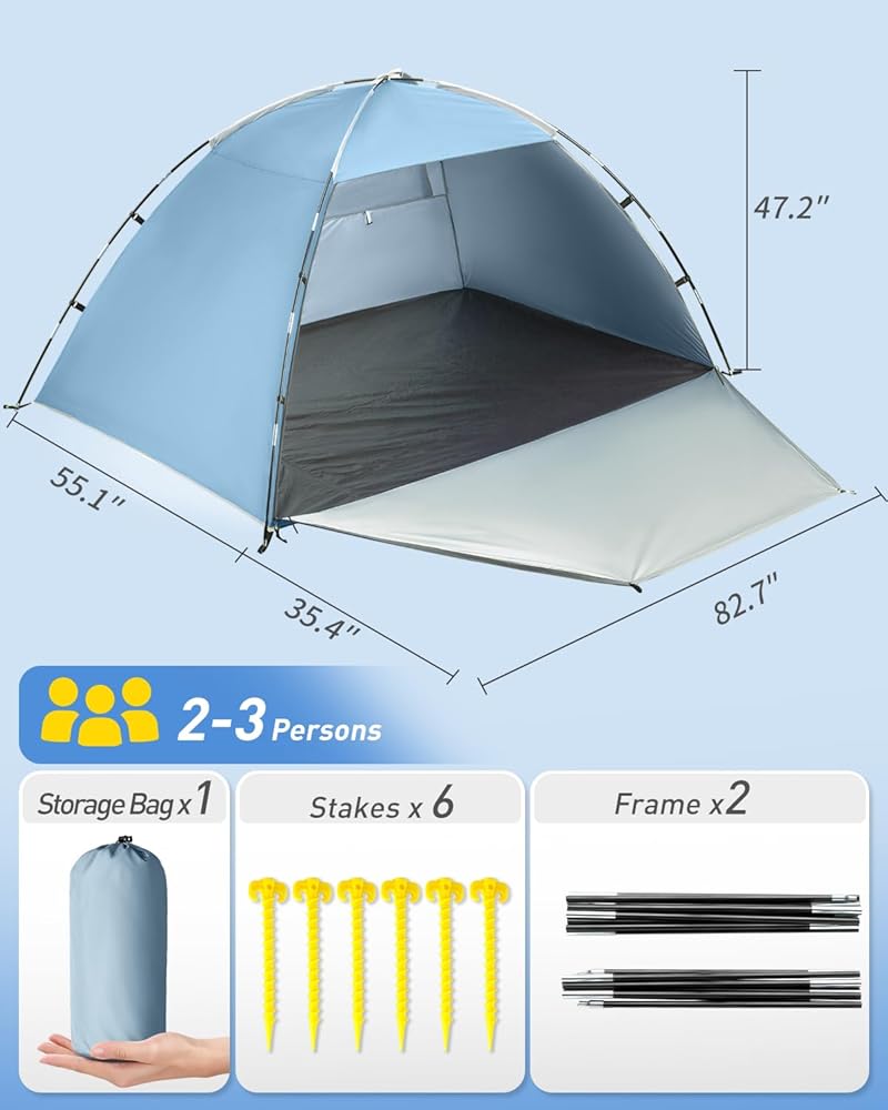 🔧 سهلة التجميع: خيمة الشاطئ هذه مجهزة بإطارين خفيفين ومتينين، وطريقة البناء بسيطة جدًا. حتى الأشخاص عديمي الخبرة يمكنهم إكمال البناء في غضون خمس دقائق، والخيمة مجهزة بستة أوتاد لتوفير استقرار أفضل.
