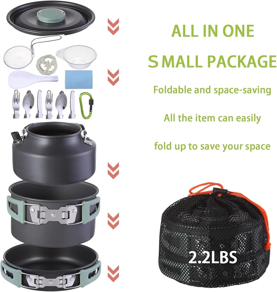 • 3. 【خفيفة الوزن وسهلة الحمل 】 مصنوعة من الألومنيوم خفيف الوزن، مع تصميم غطاء خاص ومقابض قابلة للطي لمجموعة أواني الطهي، فهي تأخذ مساحة أقل ويسهل حملها مع معدات التخييم الخاصة بك. مخزنة في حقيبة شبكية مع حلقة تسلق، يمكنك تعليقها على حقائب الظهر الخاصة بك بسهولة.