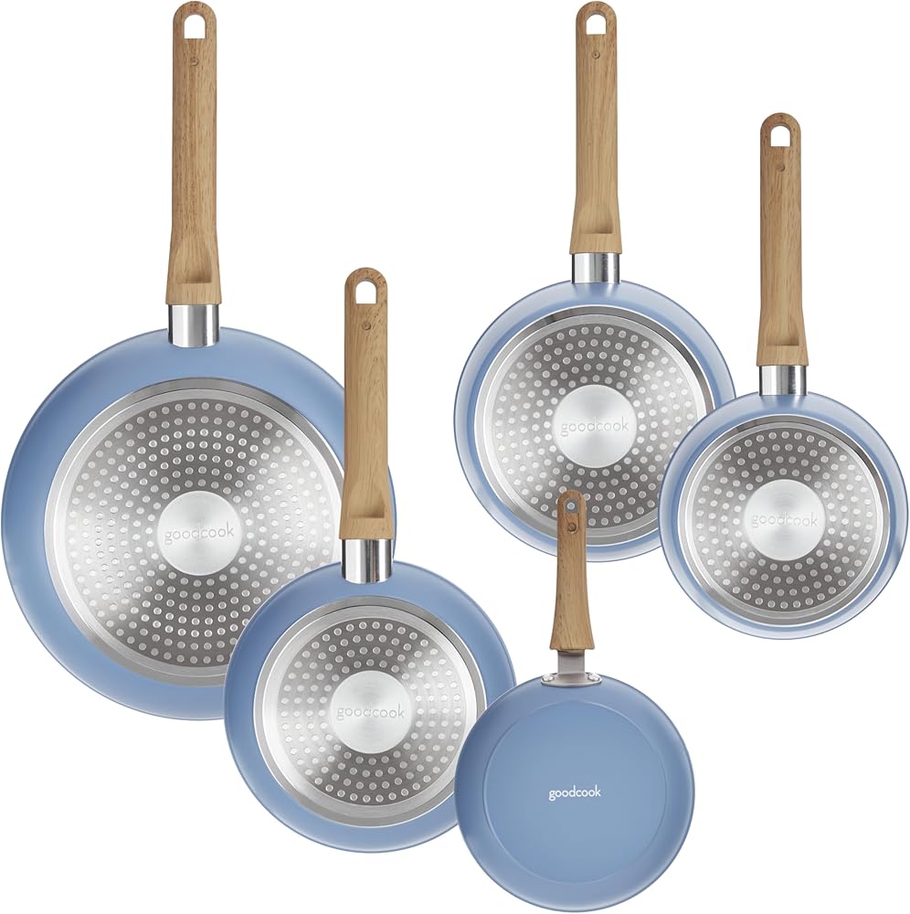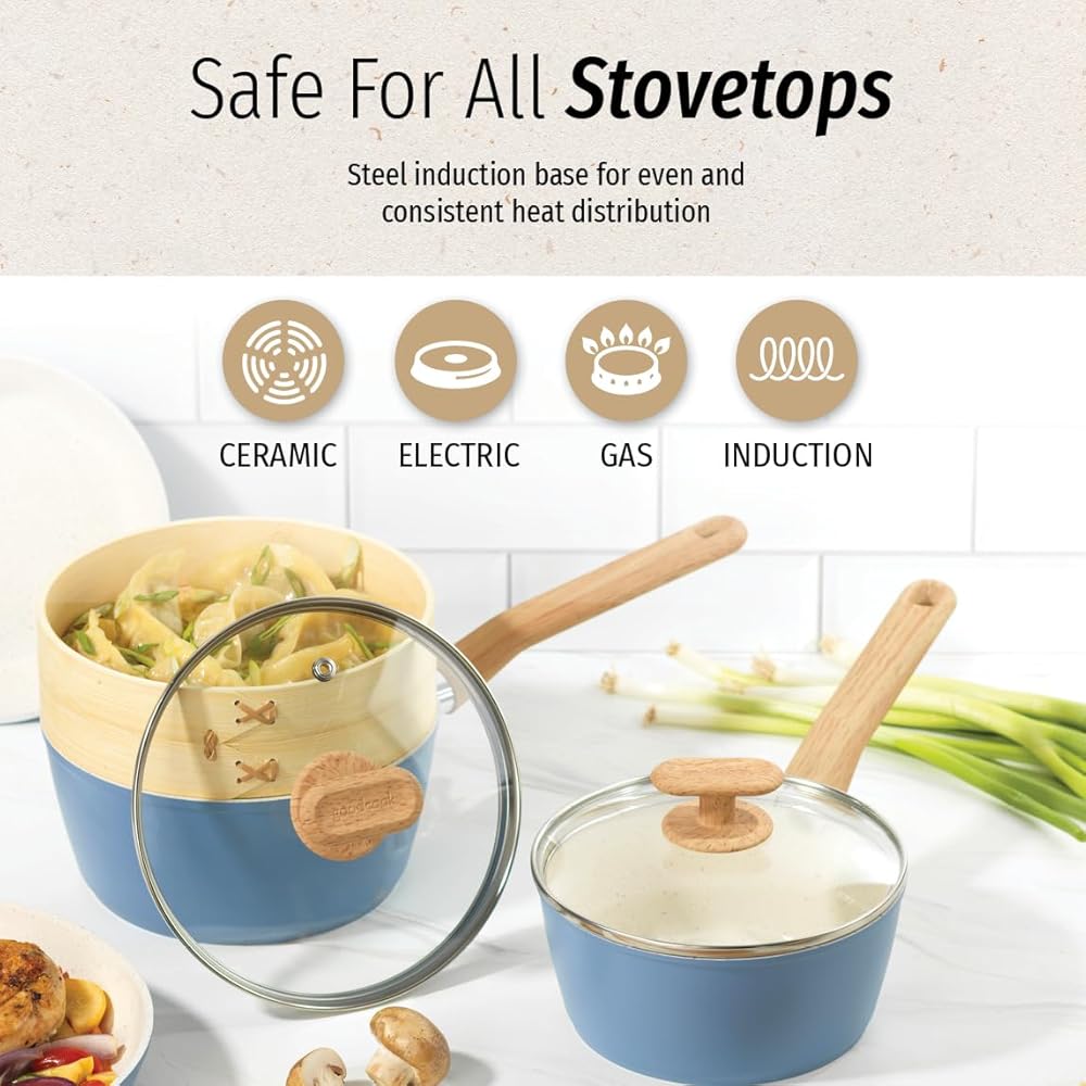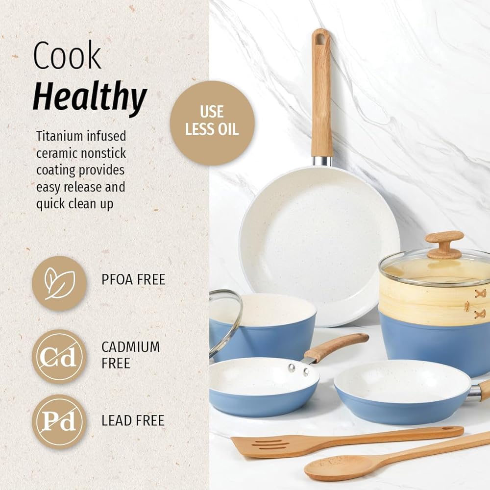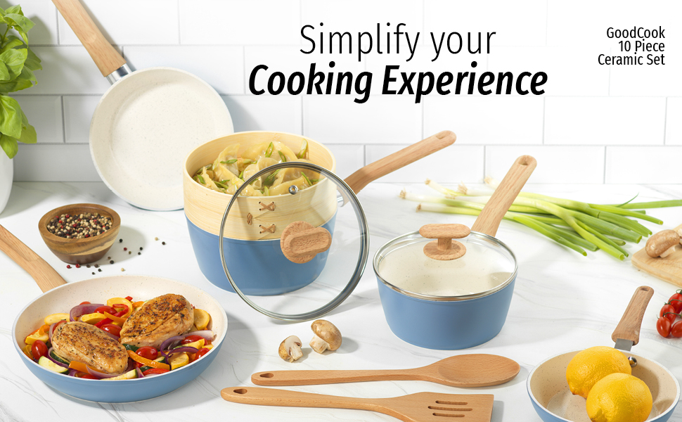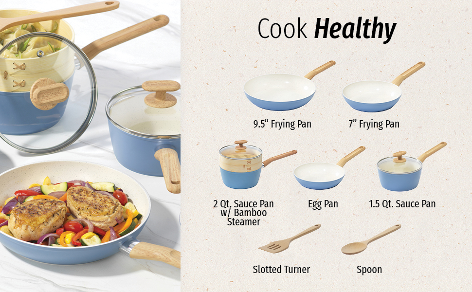 Bring high-quality cookware to your home kitchen with the GoodCook Healthy Ceramic Titanium-Infused 10-Piece Cookware Set. Designed especially for home cooks, this cookware set includes 7" and 9.5" fry pans, 1.25-quart and 2-quart sauce pans with lids, a bamboo steamer, egg pan, spoon, and slotted turner so you'll always have the cookware and utensils you need. Bigger Family? No problem, we have arge sizes (12” Fry Pan and 11” Jumbo Cooker) available. With titanium-infused ceramic nonstick surfaces, these cookware pieces allow you to cook with less oil and butter for healthier meals while ensuring an excellent mess-free release, even for the stickiest of foods. Each cookware piece distributes heat evenly for the best results and is safe for all stovetops (including induction), and both wood utensils feature ergonomic soft-touch, stay cool handles for optimal comfort and control as you cook. The cookware's trendy matte light blue exterior and sophisticated light beige interior with gray speckles adds luxurious style to any home's kitchen, and the tempered glass lids allow you to watch your food as it cooks while keeping it covered.