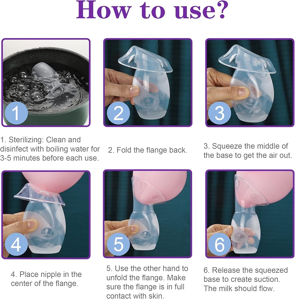 • سهل الاستخدام: مصمم ليناسب جميع أنواع أحجام الثدي. قم بطي الحافة للخلف، واضغط على منتصف القاعدة، ثم ضع الحلمة في وسط الحافة، ثم افتح الحافة، ثم حرر قاعدة الضغط لإنشاء الشفط. يجب أن يتدفق الحليب
