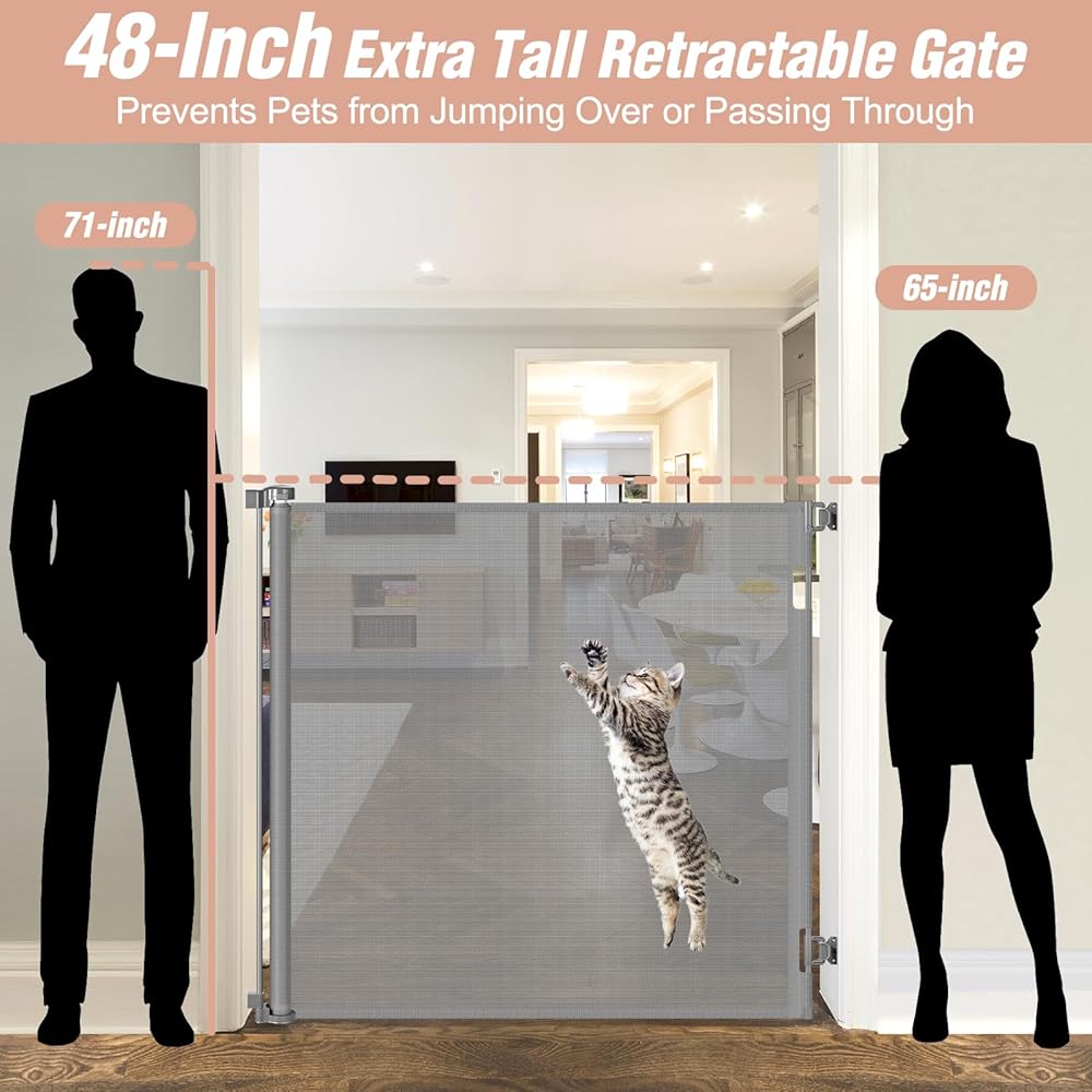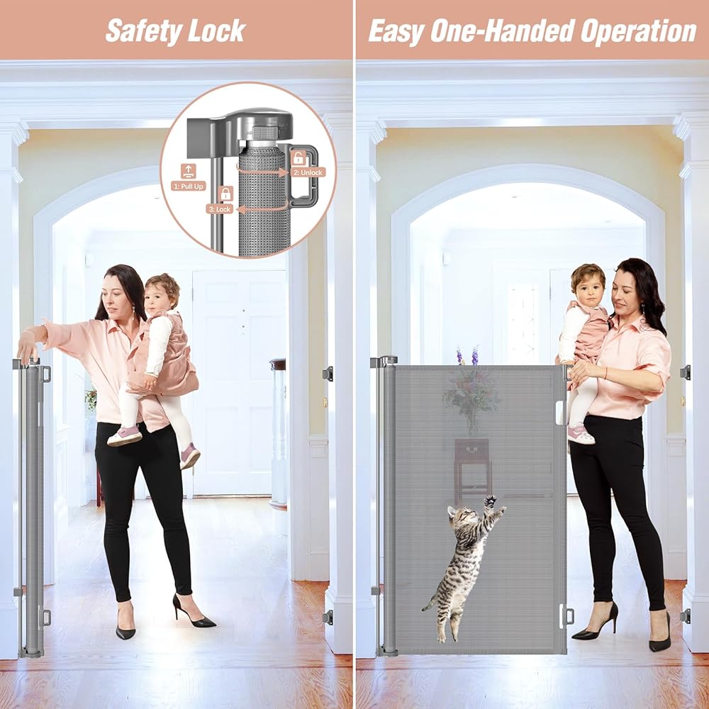 تشغيل سهل بيد واحدة: يمكن للبالغين بسهولة فتح بوابة الكلاب بطول 48 بوصة بإصبعين فقط - ما عليك سوى الضغط على الزر وتدويره، ثم رفعه. بمجرد إغلاق بوابة الكلاب القابلة للسحب بشكل آمن، سيكون من الصعب على الأطفال والحيوانات الأليفة فتحها، مما يضمن سلامتهم.