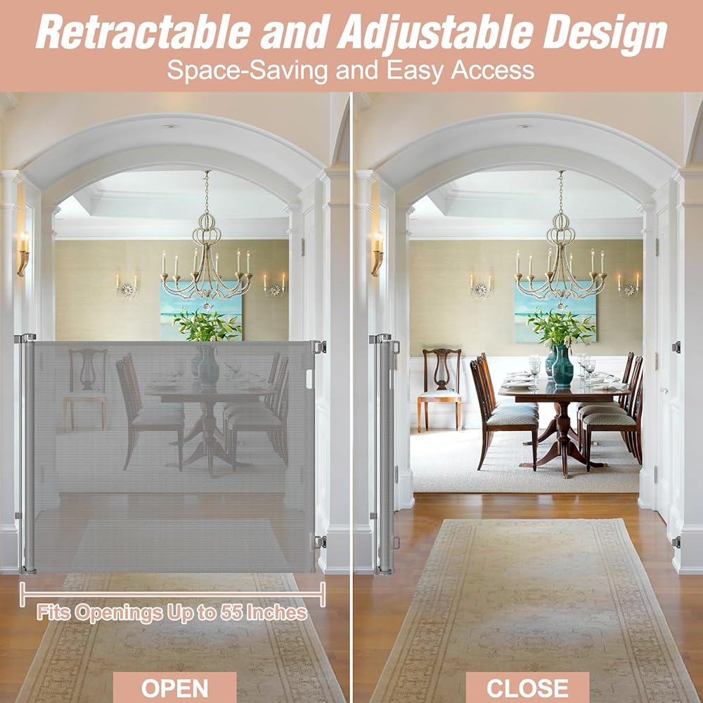 قابلة للسحب والتعديل: يمكن تعديل بوابة الأطفال القابلة للسحب بطول 48 بوصة لتناسب العرض من 0 إلى 55 بوصة، مما يجعلها متعددة الاستخدامات للمداخل الضيقة أو السلالم الواسعة. من السهل استخدامه في المناطق ذات الازدحام الشديد ويتم سحبه بسلاسة لتوفير المساحة عند عدم الاستخدام أو عند زيارة الضيوف.